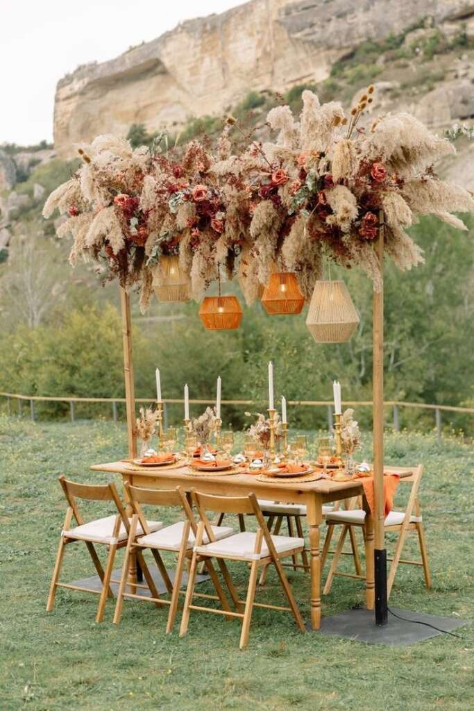 O boho sempre vem acompanhado por muitos capim dos pampas, paleta terracota e elementos em madeira.