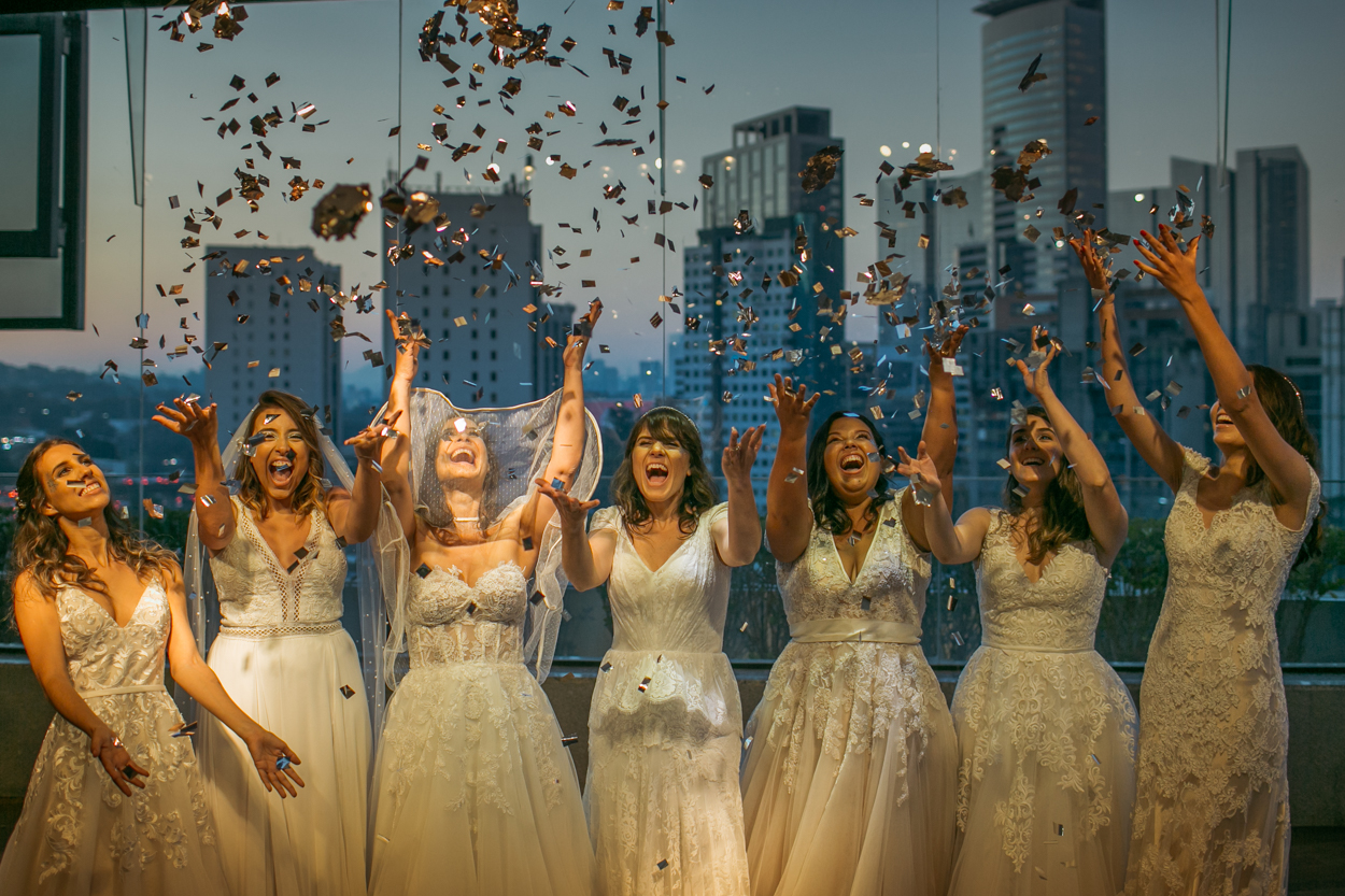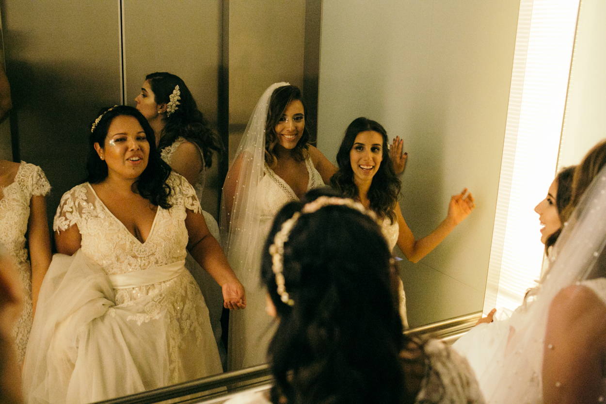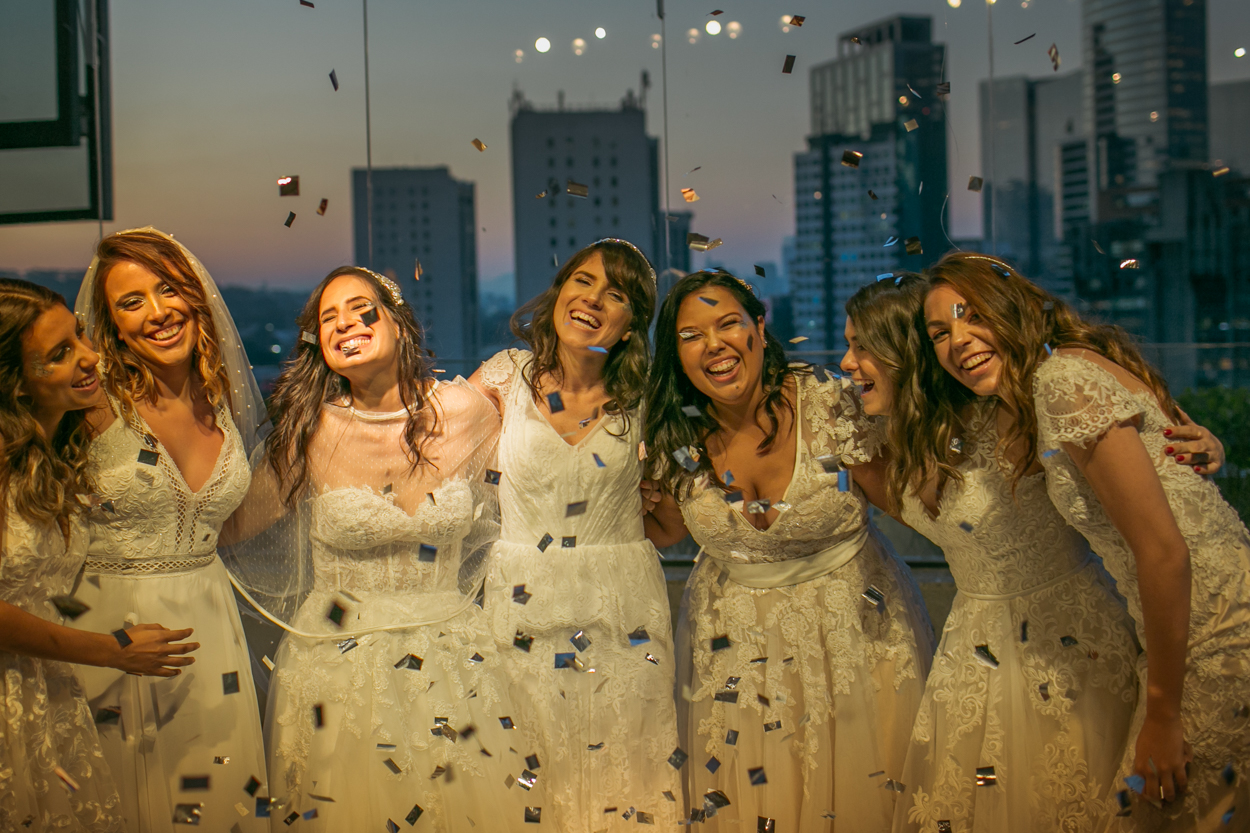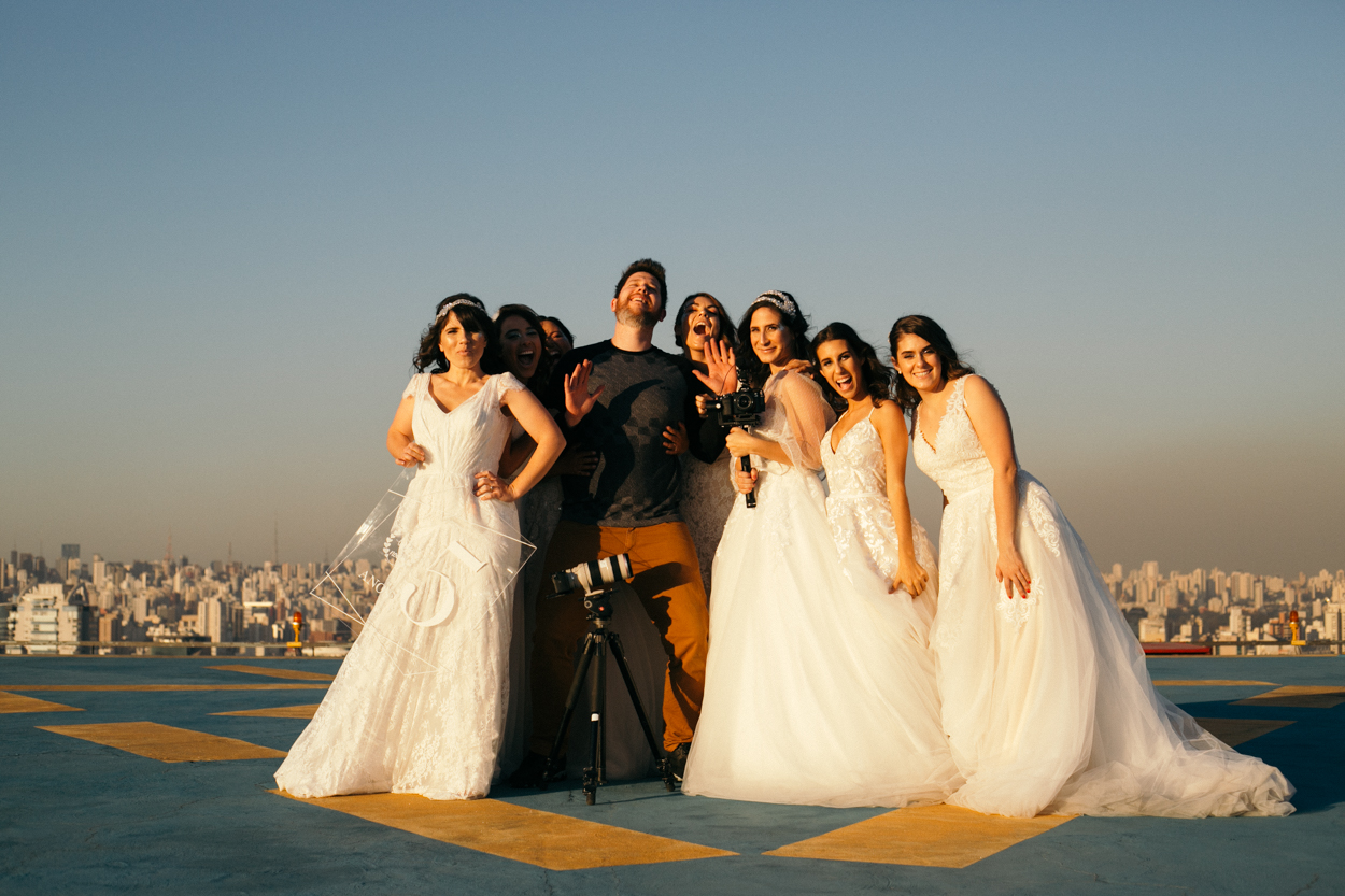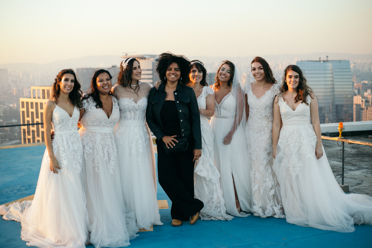 Nós, que por muitas vezes ficamos por trás das telas, idealizamos que, para esse dia ser realmente inesquecível tínhamos que nos vestir de noivas. Agora imaginem só, produzir sete noivas de uma vez só! Não foi uma tarefa fácil, mas o resultado ficou incrível!