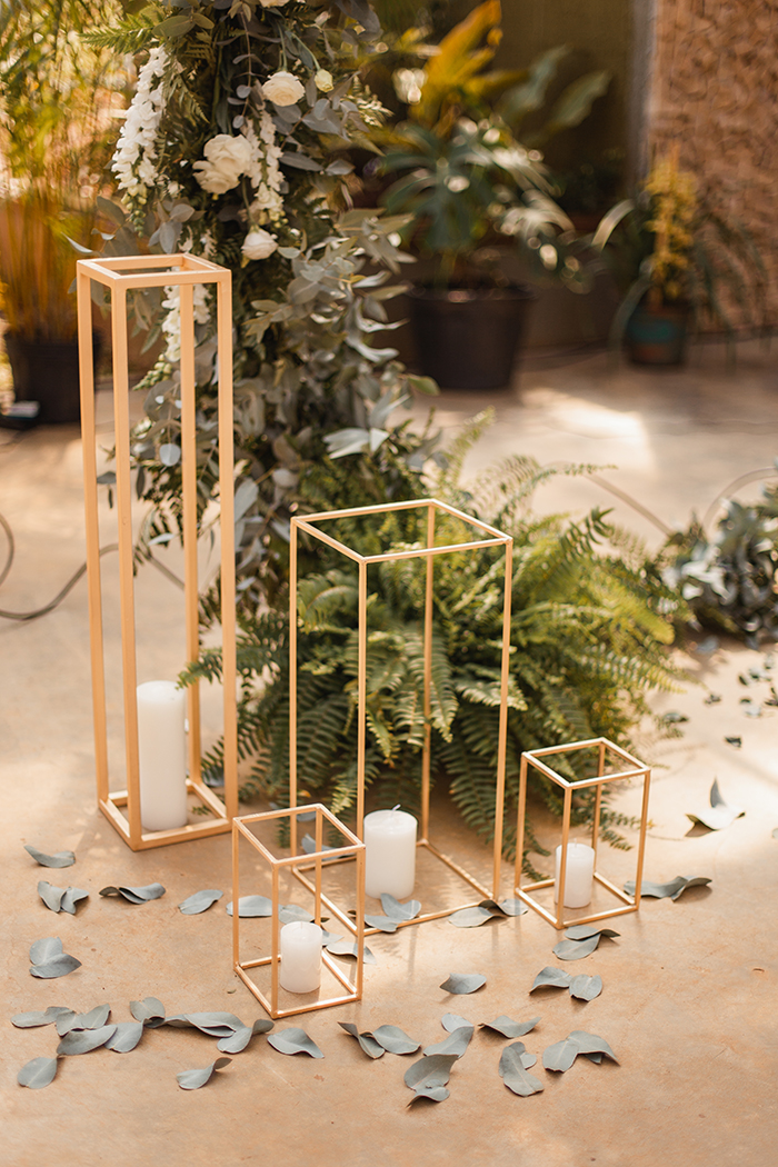 A paleta de cores era verde (folhagens, como: eucalipto e costela de Adão entre outras), branco (flores e papelaria), azul acinzentado (nos convites, na decoração e nas madrinhas uma escala mais serenity) e dourado (mesa de doces, selos da papelaria, e decoração).