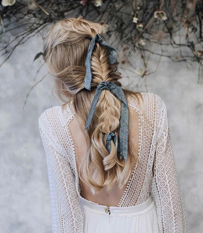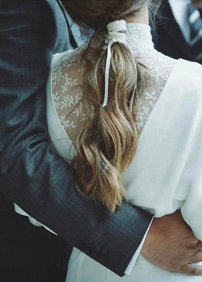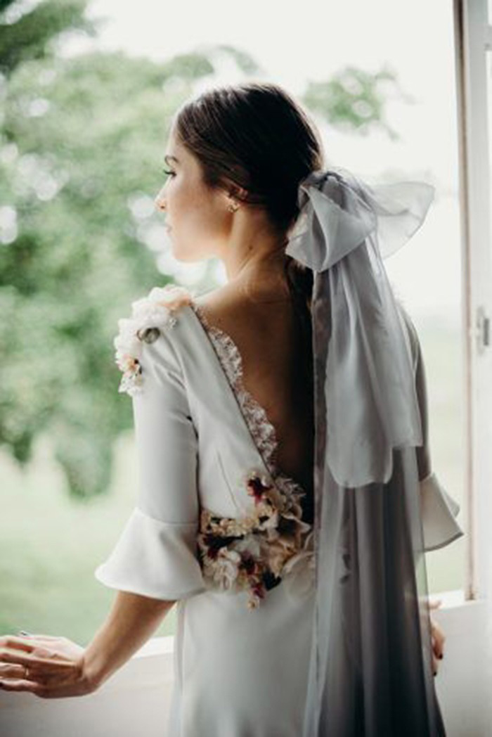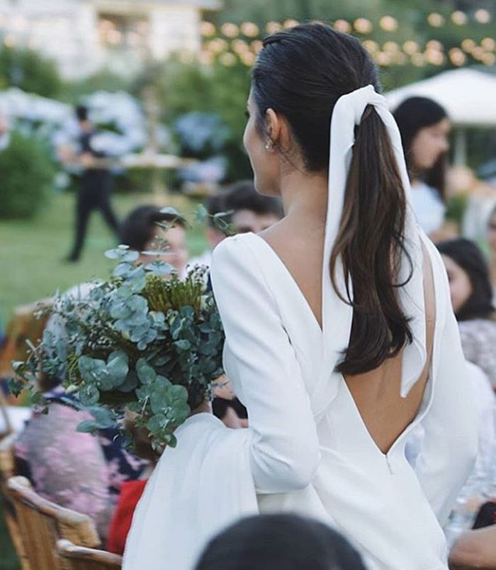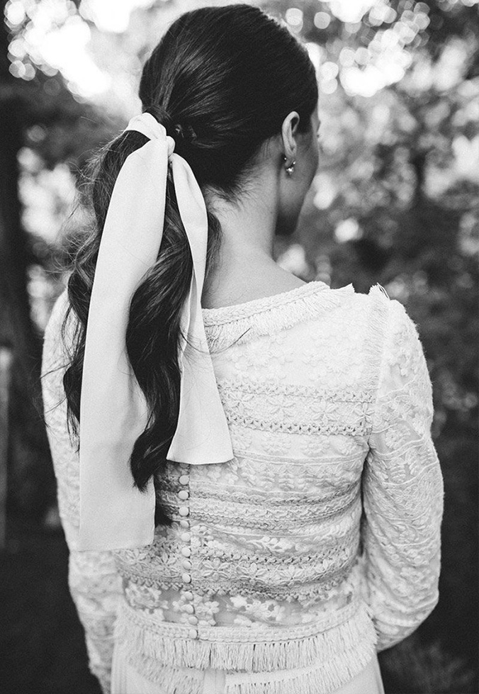 Muito usados por noivas espanholas, os laços brancos, pretos ou em cores fechadas, saíram dos vestidos e agora estão nos penteados das noivas que procuram um look mais natural e com ar de campo.