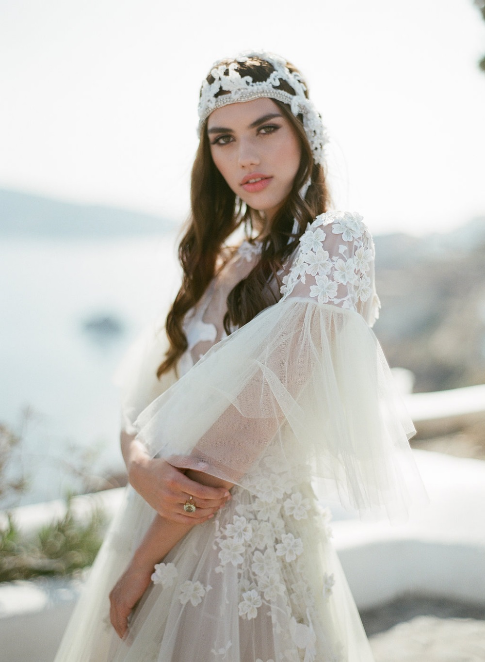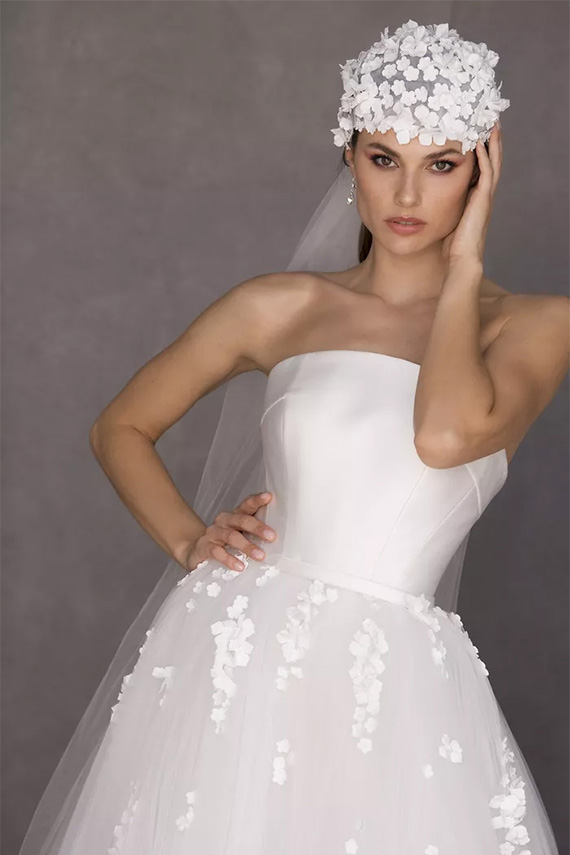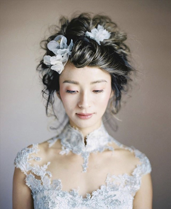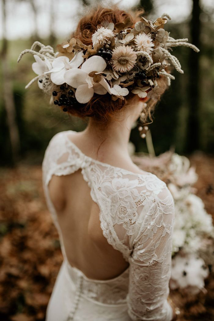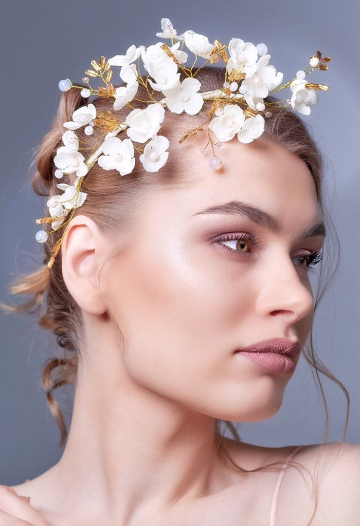 Como os apliques florais em 3D em cascata nas saias dos vestidos de noiva, as flores em 3D também vão adornar os penteados das noivas este ano. Leves e divertidos, esses acessórios para cabelo são perfeitos para casamento no campo ou casamento na praia. Uma vantagem é que as flores 3D não murcham como as flores naturais durante o dia. Elas estão sendo usadas em tiaras, em penteados à la Frida Khalo ou flutuando livremente pelos cabelos.