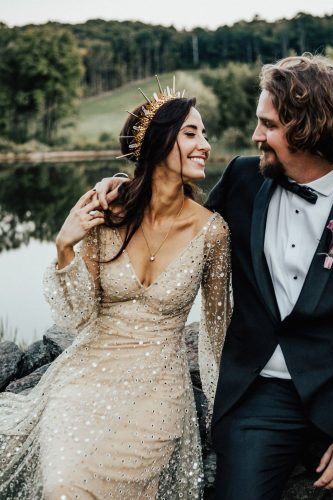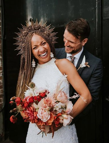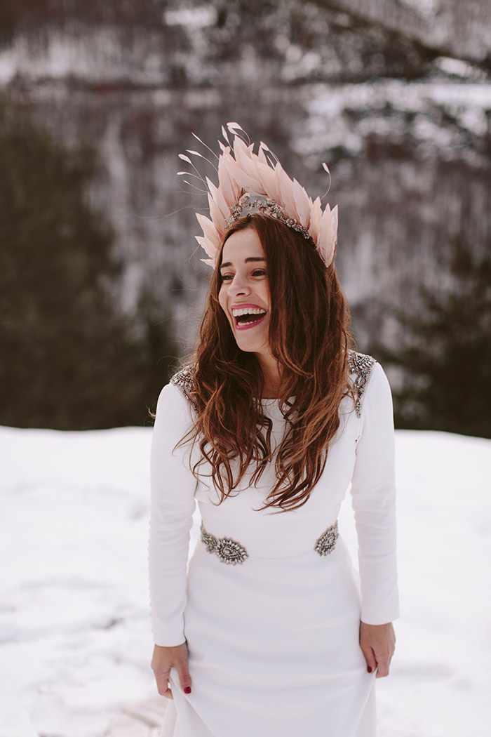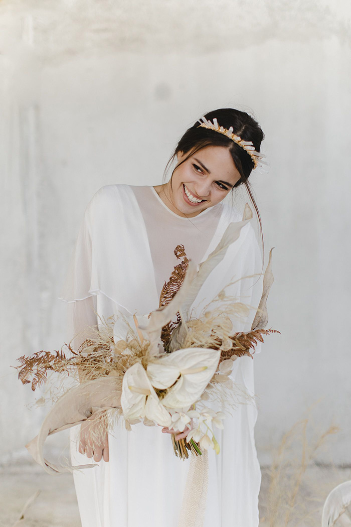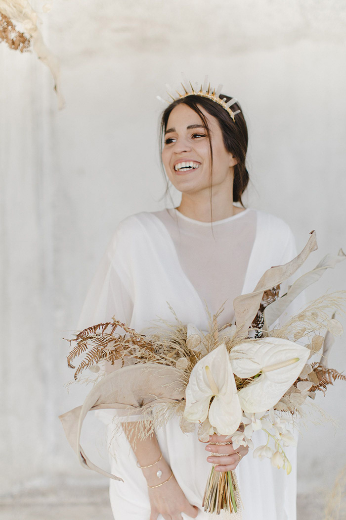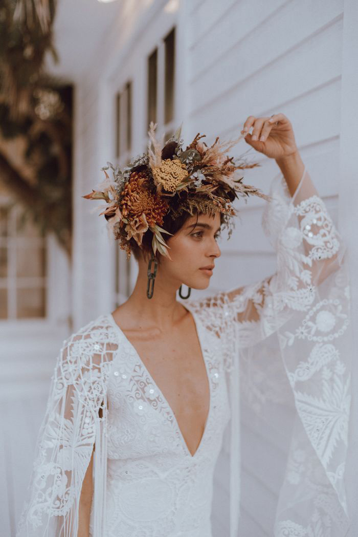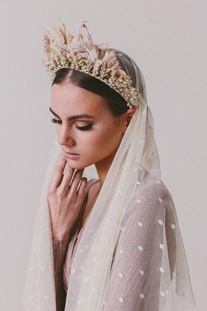 Estamos vendo coroas com materiais exclusivos que proporcionam uma aparência super moderna, romântica e única. Pense em misturas de pedras preciosas e semi preciosas, cristais, penas, rendas, tecidos e metais em formatos que variam do romântico ao contemporâneo.