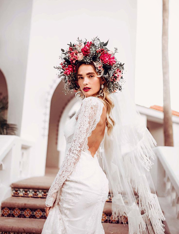 A coroa de flores veio para ficar- mas está sempre sendo reinventada. Este ano a inspiração vem dos buquês de noiva desconstruídos: flores do campo em forma de grandes tiaras do jeito que a Frida Khalo usava, com volume no alto da cabeça.