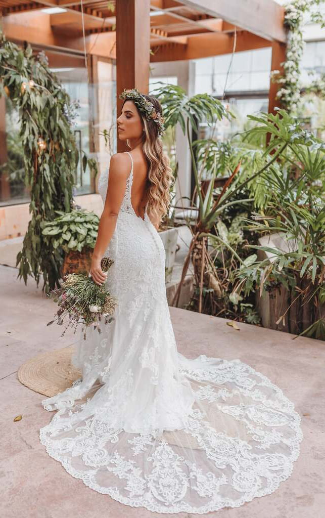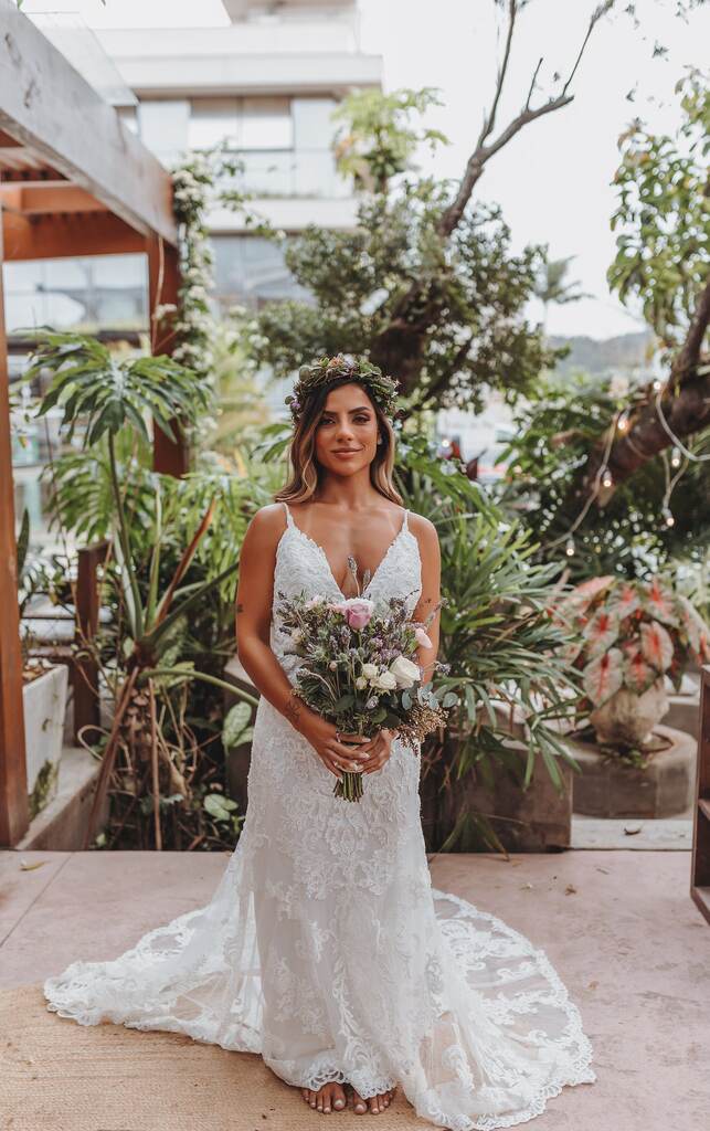 Laís arrasou na escolha do seu visual! Ela trocou o clássico véu e grinalda por uma coroa de flores frescas e finalizou a produção com um mix de flores numa vibe bem romântica, formando um buquê desconstruído.