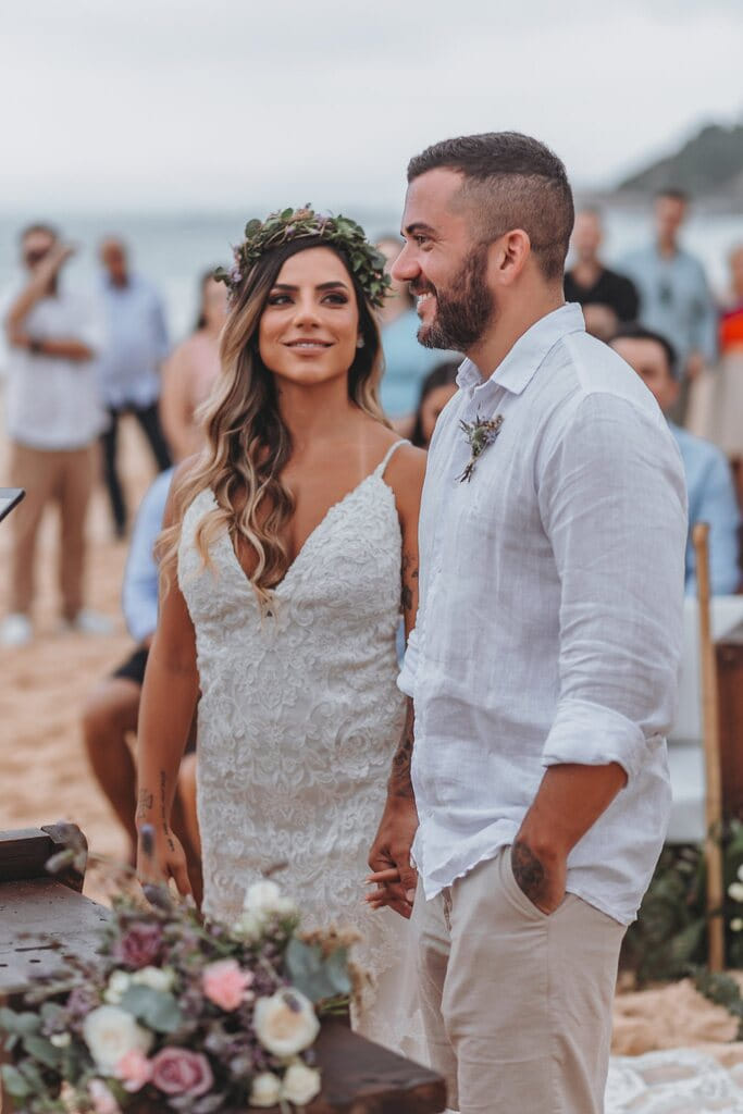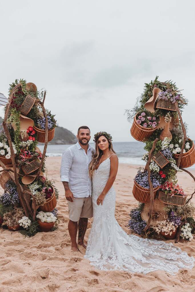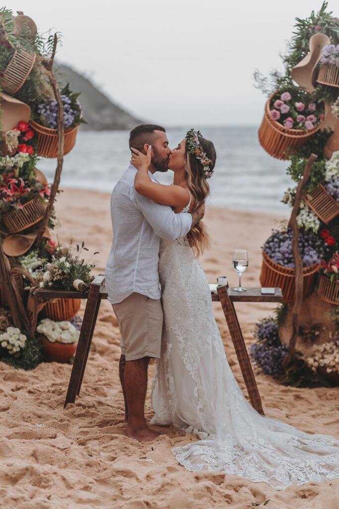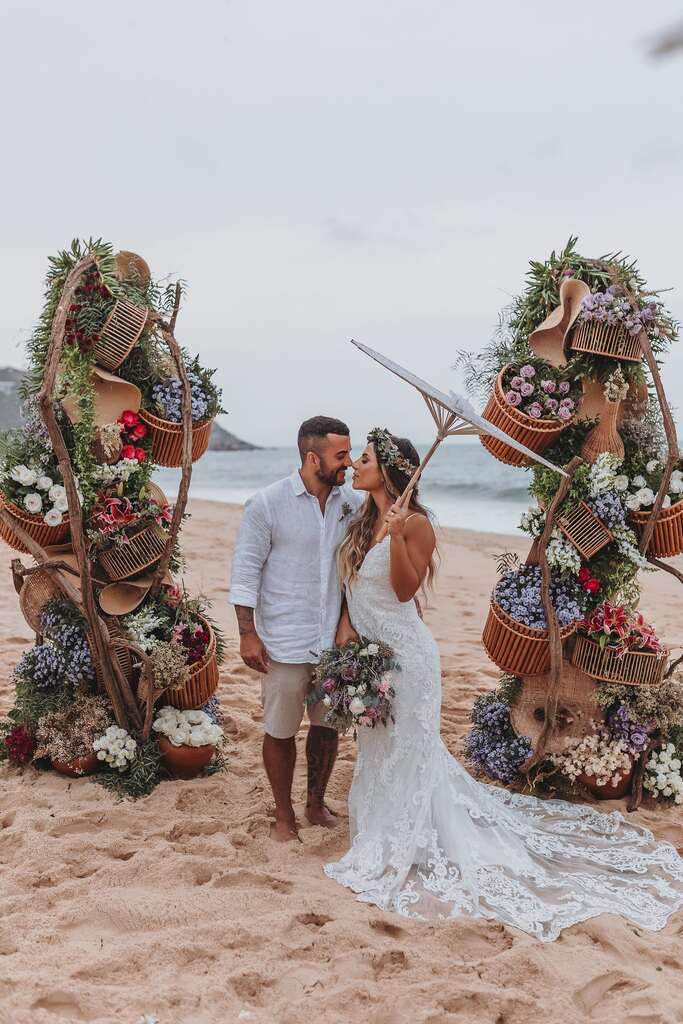Brincadeiras à parte, a inspiração de hoje é um casamento pé na areia lindo. A decoração vai “contra” o tropical repleto de cores vibrantes e abre espaço para o boho o delicado.