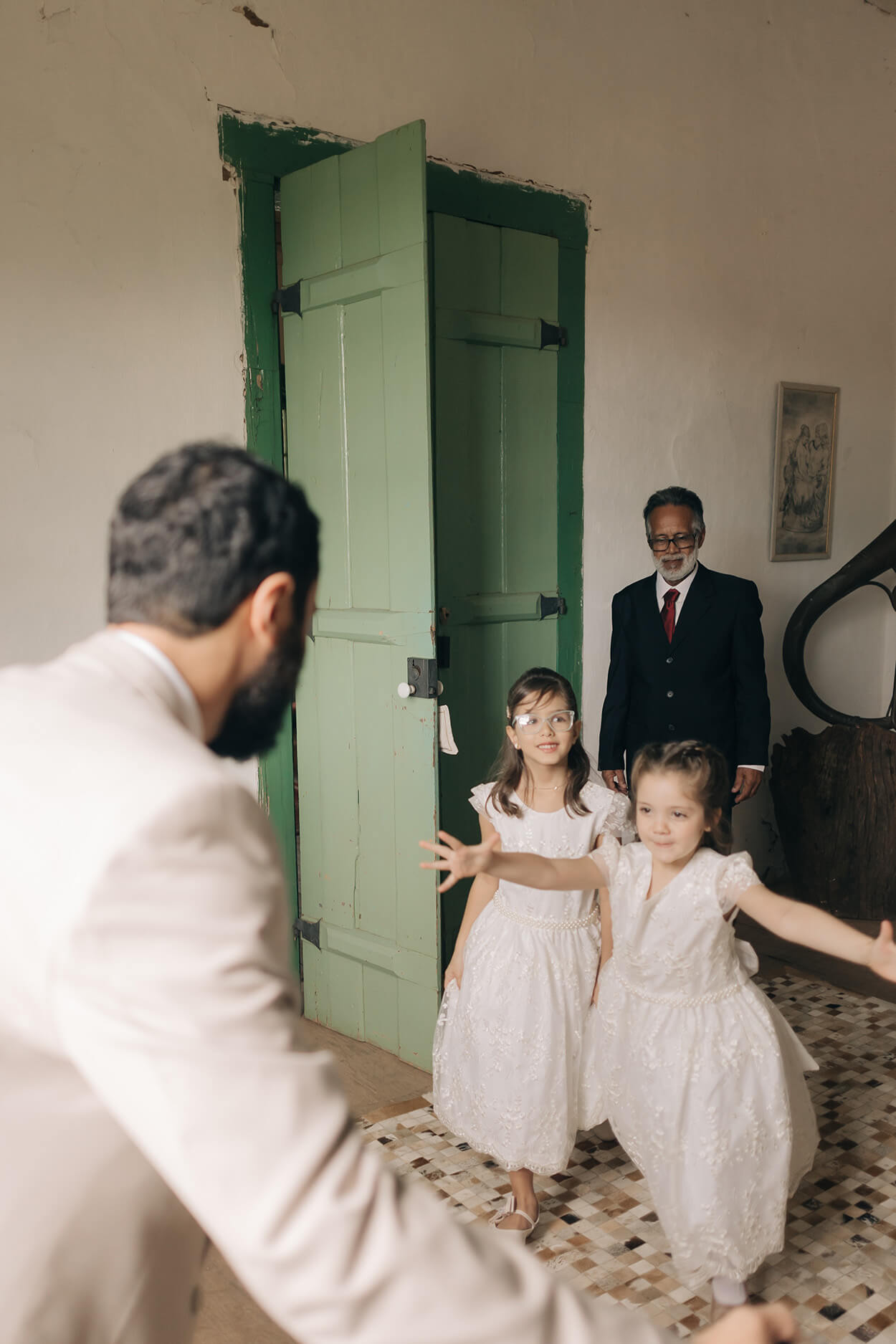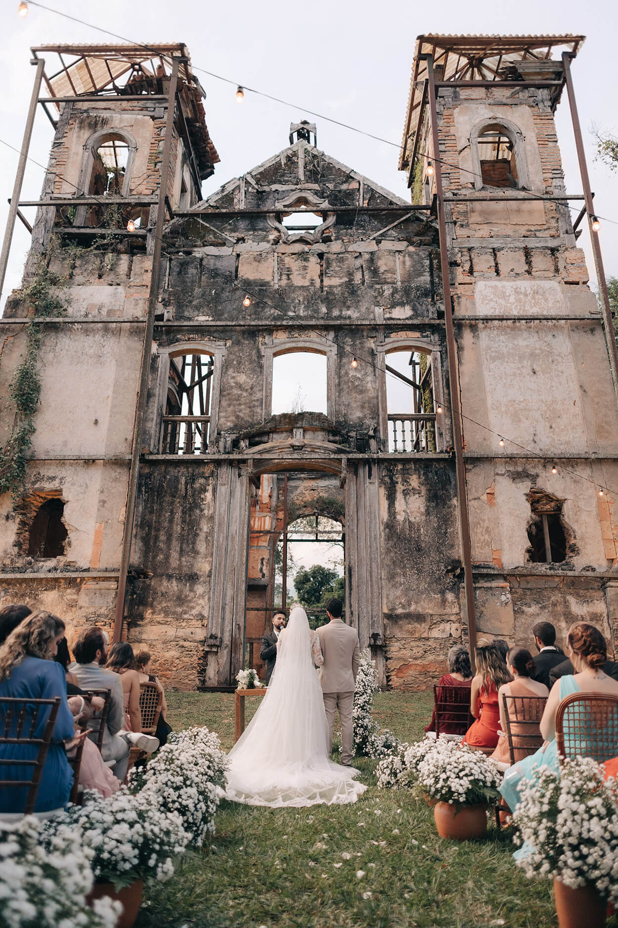Bom, havíamos combinado uma entrada diferente. Eu saí sozinha da casa da fazenda, esperaria meu pai tocar o sino e aí sim iríamos buscar minha mãe para seguirmos os três para o altar. E foi nesse momento que eu o vi aguardando… ele estava chorando como uma criança.