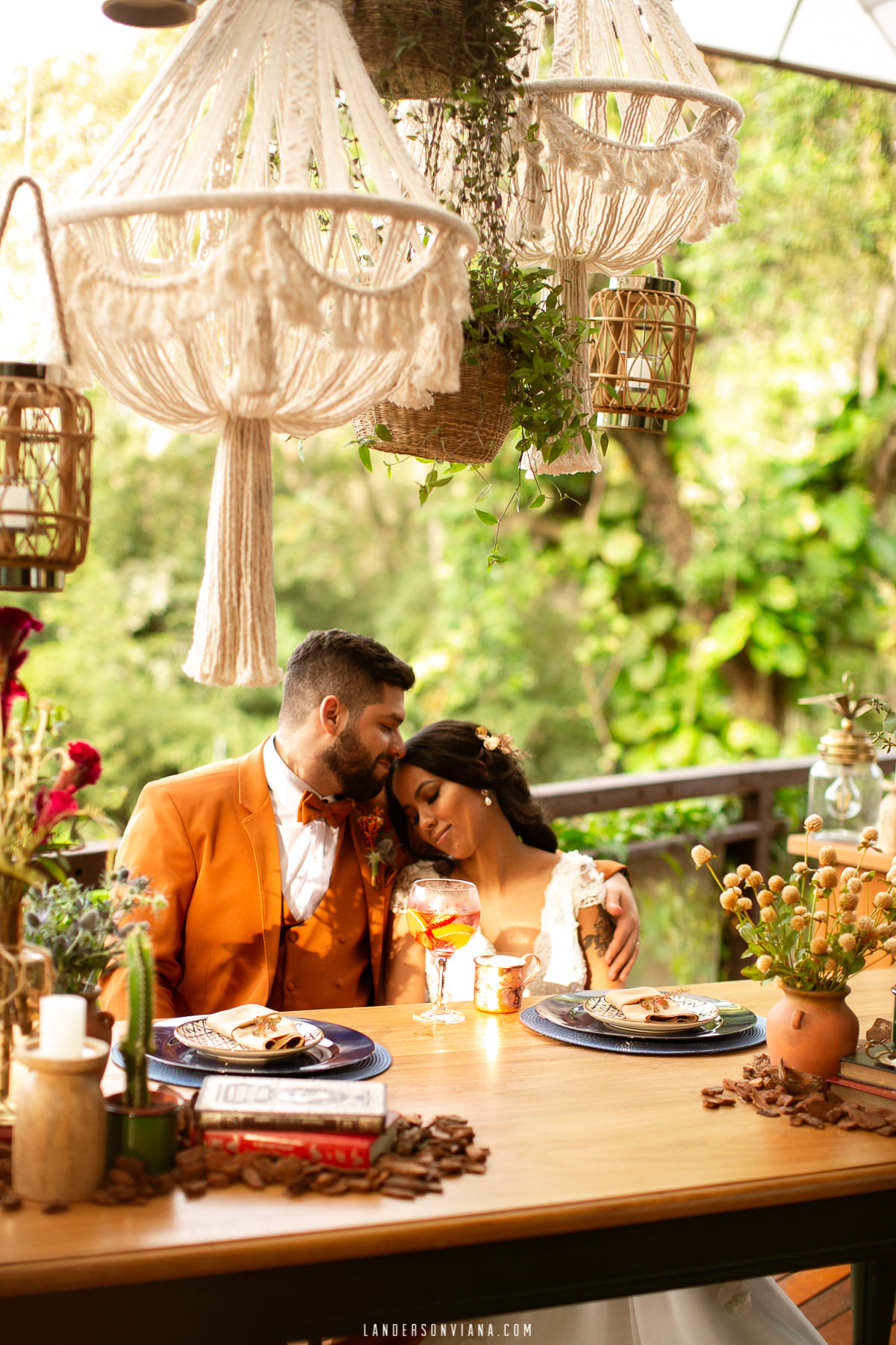 Na mesa dos noivos foram utilizados pendentes em macramê e lindas luminárias, além de plantados que trazem leveza e muito encanto harmonizando o ambiente.