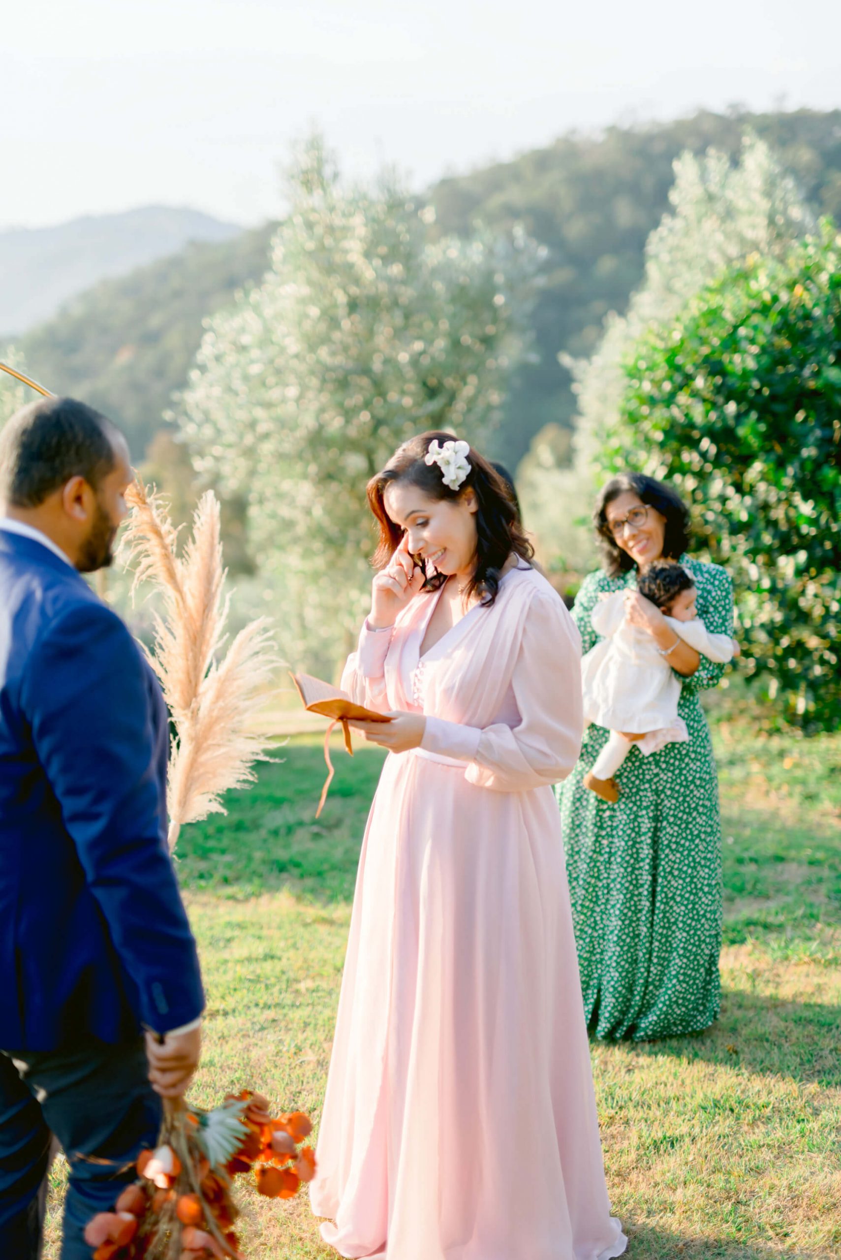 “Me lembro que eu tive um dia da noiva muito feliz com minha mãe (que fez o meu vestido!), irmã, tias e madrinhas. Cheguei pontualmente na igreja, mas tive que esperar alguns atrasadinhos. Me lembro da igreja cheia, um noivo nervoso me esperando, e tudo lindo como havíamos organizado. Além de uma música especial composta e tocada pelo noivo durante o momento dos votos, e que me fez chorar muito”.