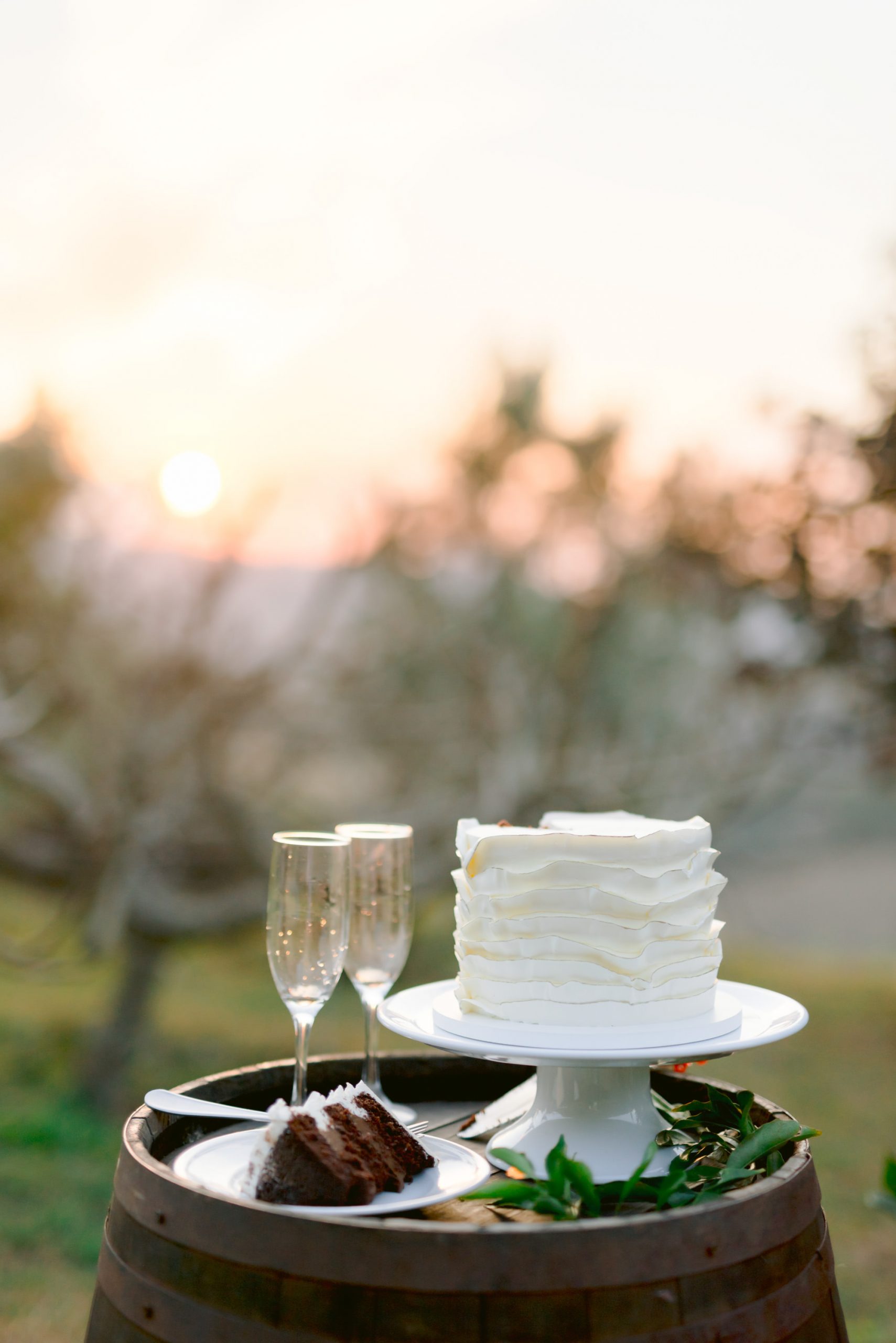 Eles priorizaram ter uma vista linda das montanhas e ter um bolo solitário, a ideia era algo com estilo rústico para deixar ainda mais charmoso. “Eu pedi que o bolo fosse mais clássico e clean, que no chão tivesse muito verde e flores brancas e o barril traria o ar rústico. O segredo está em ter uma base, digamos que, clássica, e incluir elementos no estilo pretendido, assim conseguimos ter um resultado em que o rústico seja muito elegante”.