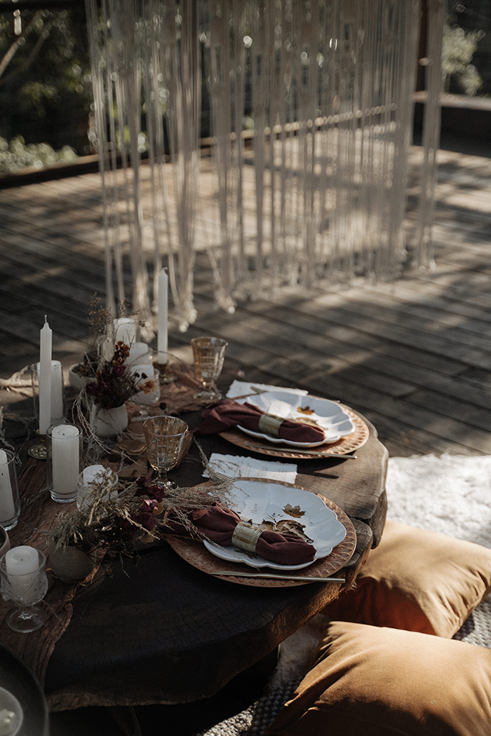 A decoração boho chic contou com detalhes que amamos como macramê, cadeira pavão e capim das pampas. Tudo numa paleta de cores que combinava com o lugar.