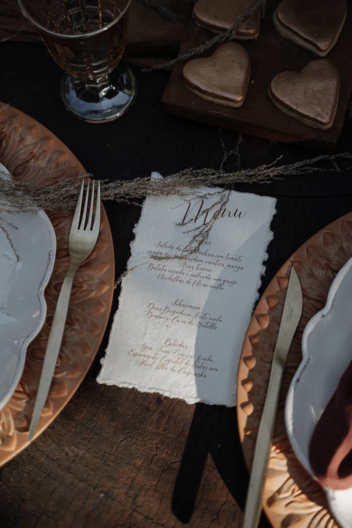 “Nossos votos em algodão cru e escritos com pirógrafo (uma ferramenta que esquenta e queima o material alterando a cor. Muito usado com madeira). Ficou parecendo um pergaminho e enrolamos eles juntos e amarramos com uma cordinha de couro junto com nossas alianças. As nossas alianças também fomos nós que fizemos para o nosso casamento em 2016”.