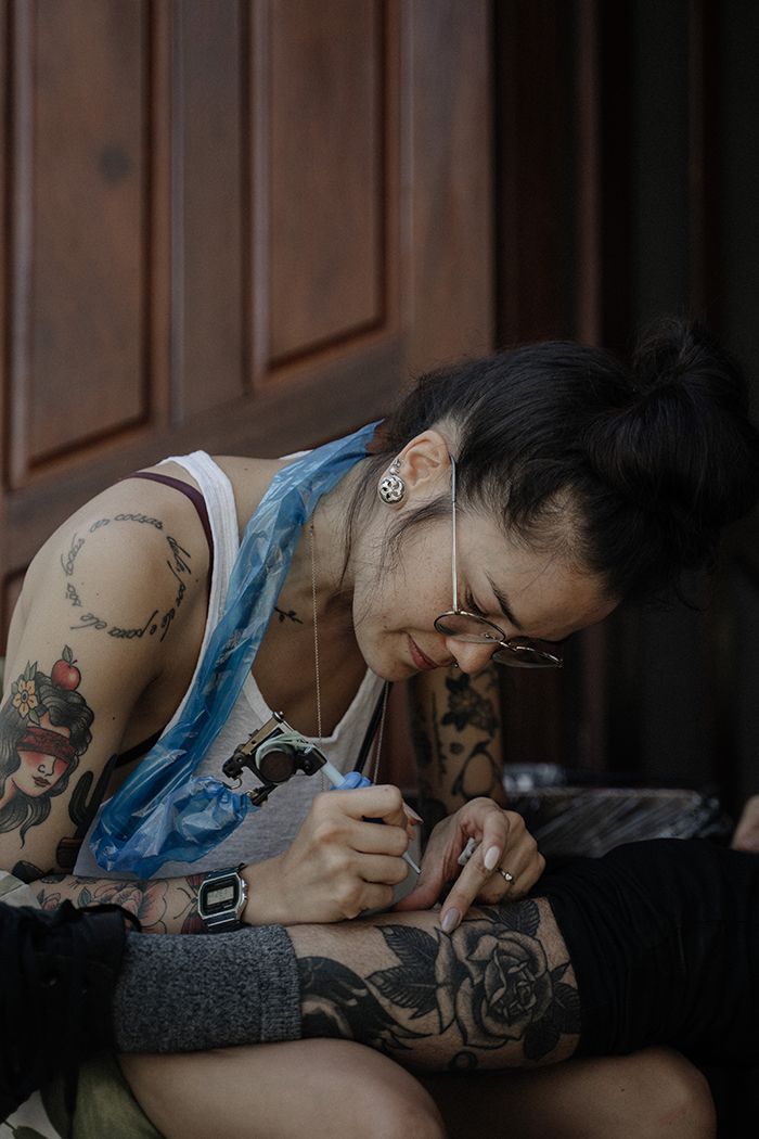 O Douglas é tatuador e decidiram fazer uma tatuagem de casal. “Para ‘melhorar’ ele fez a minha e eu fiz a dele. Como não tenho experiência, a minha tatuagem ficou linda e a dele ficou horrível. Mas a gente amou!”.