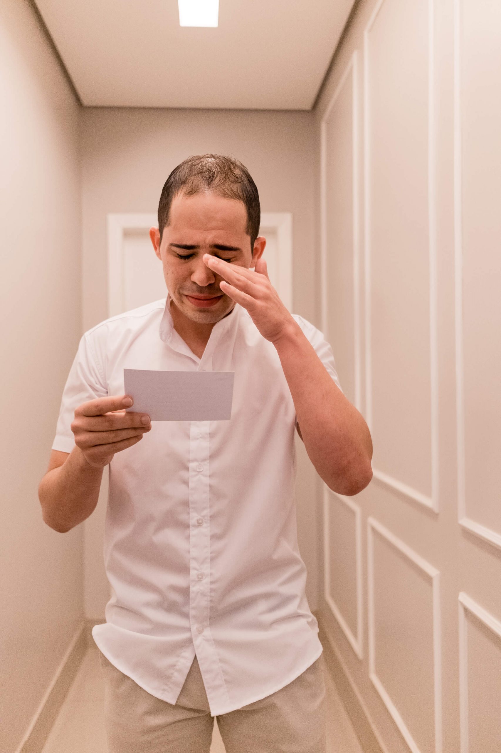 Para Vanessa aquele momento que faltou ar foi quando o Diogo chegou e a cerimonialista foi buscá-lo no carro. De olhos vendados, o Diogo entrou na casa, sem saber o que estava acontecendo. “Ele achava que a ter um churrasco e apenas isso. Então, para mim ver ele de olhos vendados foi um momento muito marcante”.