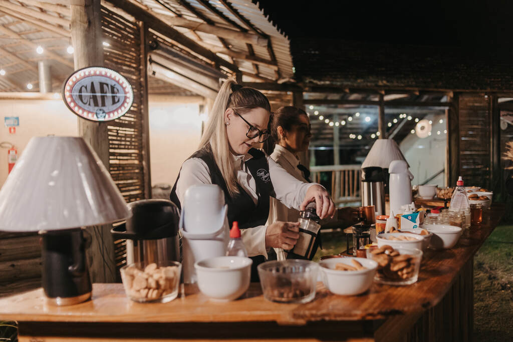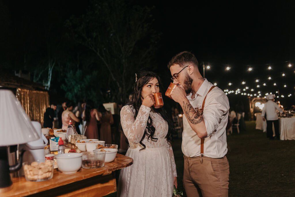 Servimos hambúrgueres, batatas, carnes, bar de café e algumas outras coisas. Também convidei um amigo para celebrar o casamento, o que deixou esse momento mais íntimo.”