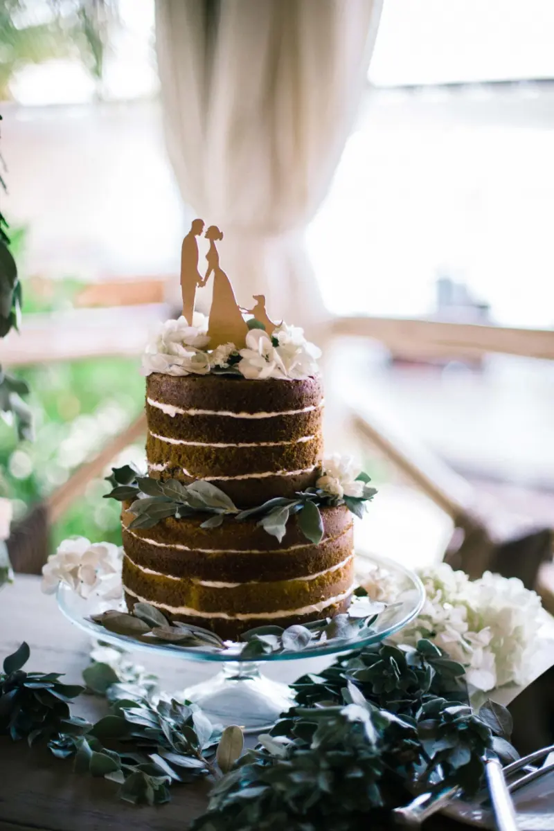 O topo do bolo de casamento civil pode ser simples usando elementos como os noivinhos ou as iniciais do casal para compor a decoração do topo de bolo. Flores e folhagens também ficam muito delicadas posicionadas ao topo do bolo.