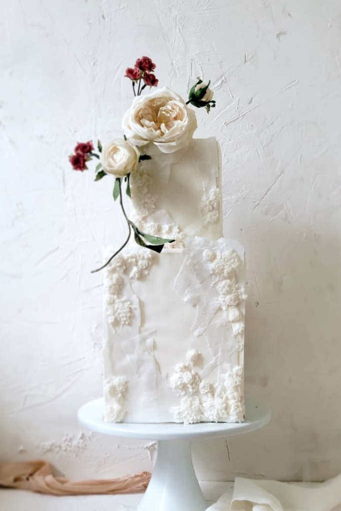 As coberturas seguem a mesma proposta dos bolos redondos. Cada uma delas corresponde a um tipo e estilo de casamento. Veja algumas opções: