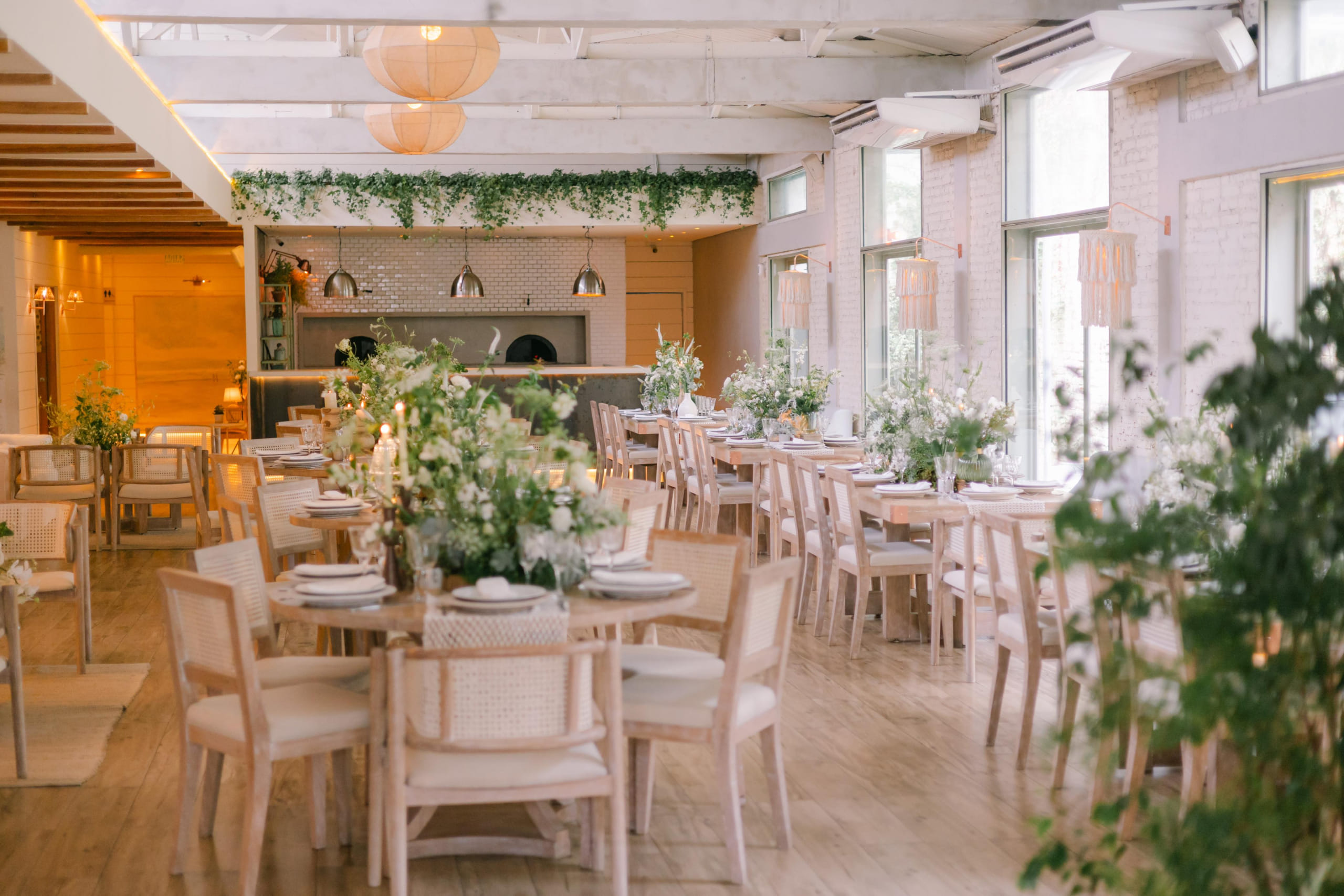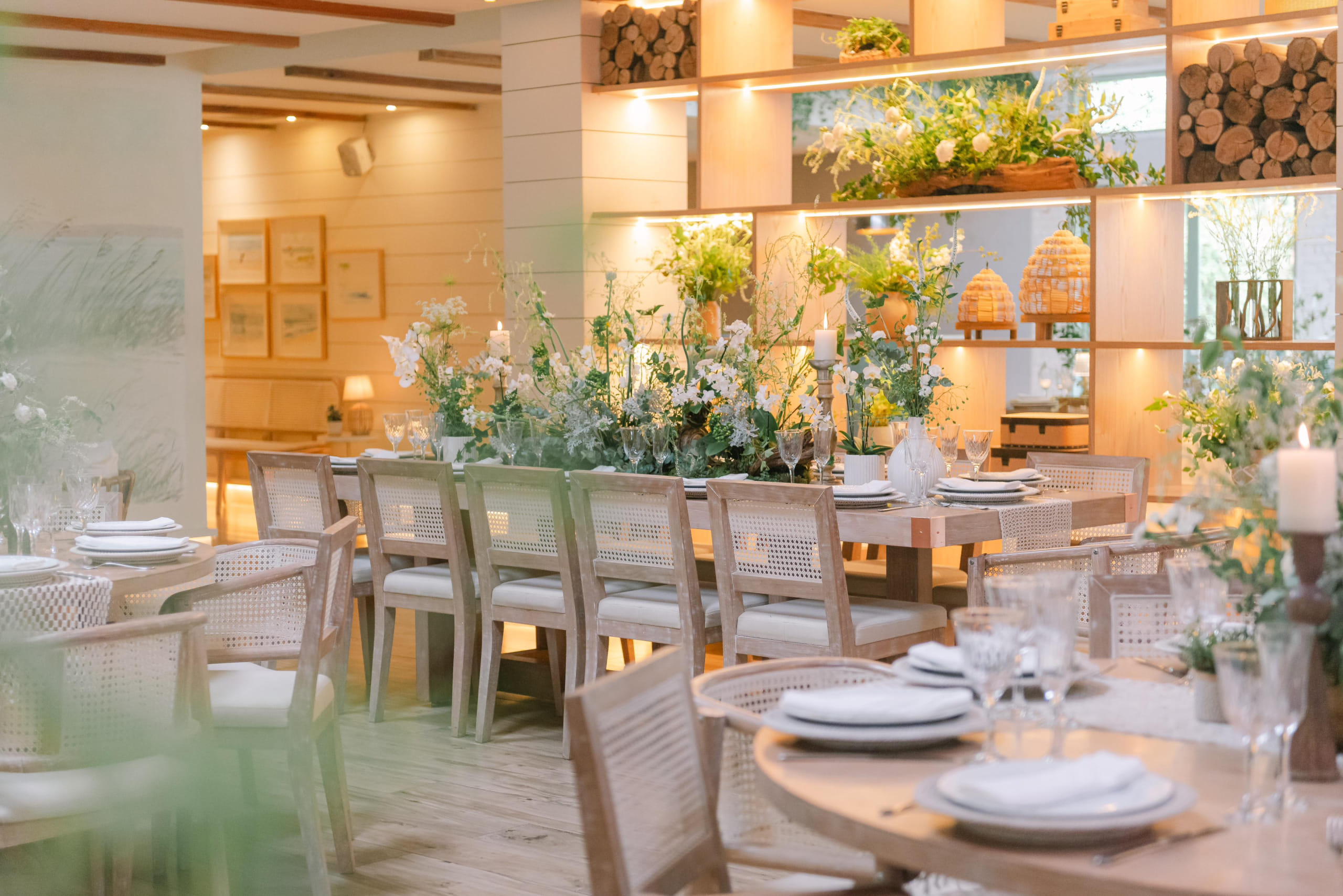 Lá, os ambientes são decorados com elementos orgânicos, como madeira, fibras, cordas, linho, algodão e pedras naturais. Tudo pensado para que noivos e convidados realmente estejam imersos na essência do espaço.