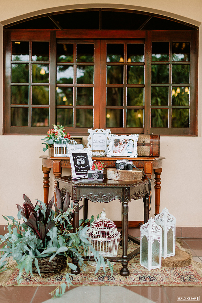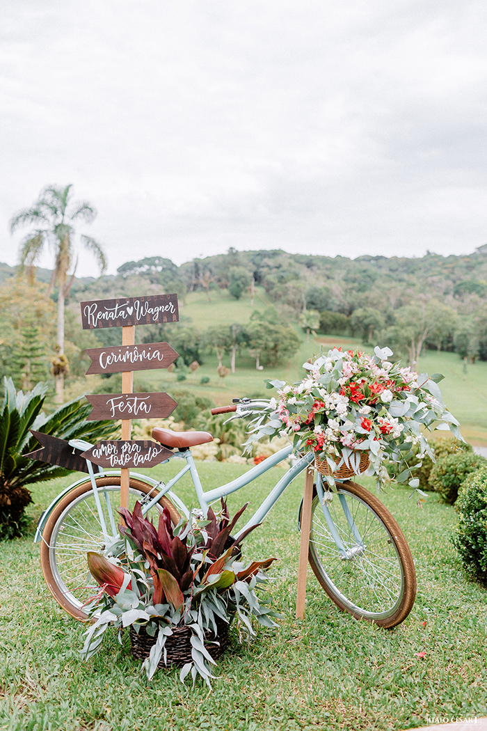 A papelaria, caixas-convite para os padrinhos, porta-retratos, plaquinhas para entrada da noiva e alianças, porta-alianças, chuva de arroz, fotos tipo polaroid, baú com papéis e caneta para os convidados escreverem mensagens e guardarem no baú; plaquinhas para cadeiras, plaquinhas seta e bicicleta, ufa quanta coisa foi DIY!