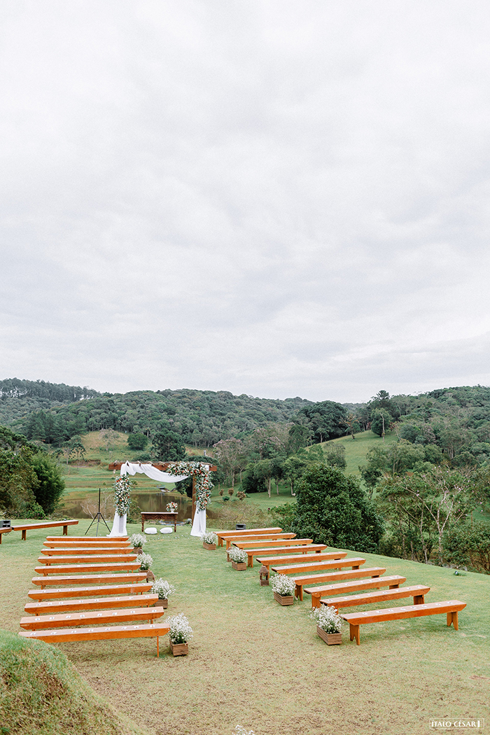 O pai da Renata ajudou demais, desde recortar os tecidos para os caminhos de mesa, carregar móveis e colocar os bancos da cerimônia no lugar.