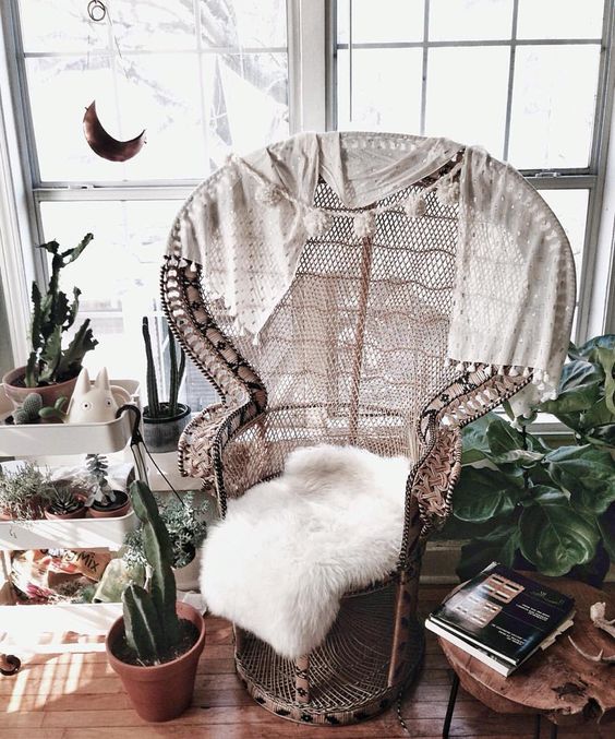 Por causa da sua natureza, optar por uma cadeira pavão ou Emanuelle na decoração da casa nova é dar mais personalidade ao ambiente. Sozinha ou com alguns adornos a cadeira se torna o ponto focal do espaço. A decoração fica única, cheia de glamour e com um toque boho chic.