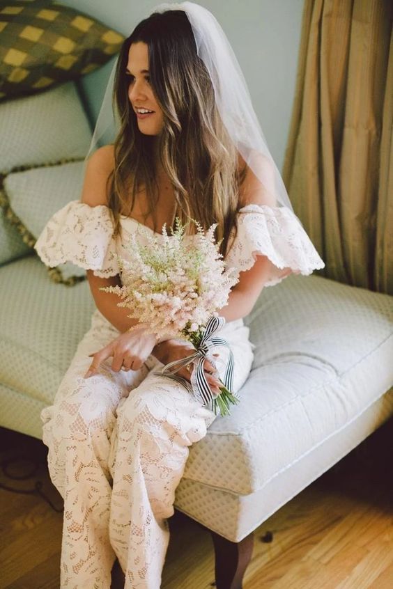 Com exceção do véu catedral, todos os tipos de véu funcionam bem com calças, jumpsuits e shorts!