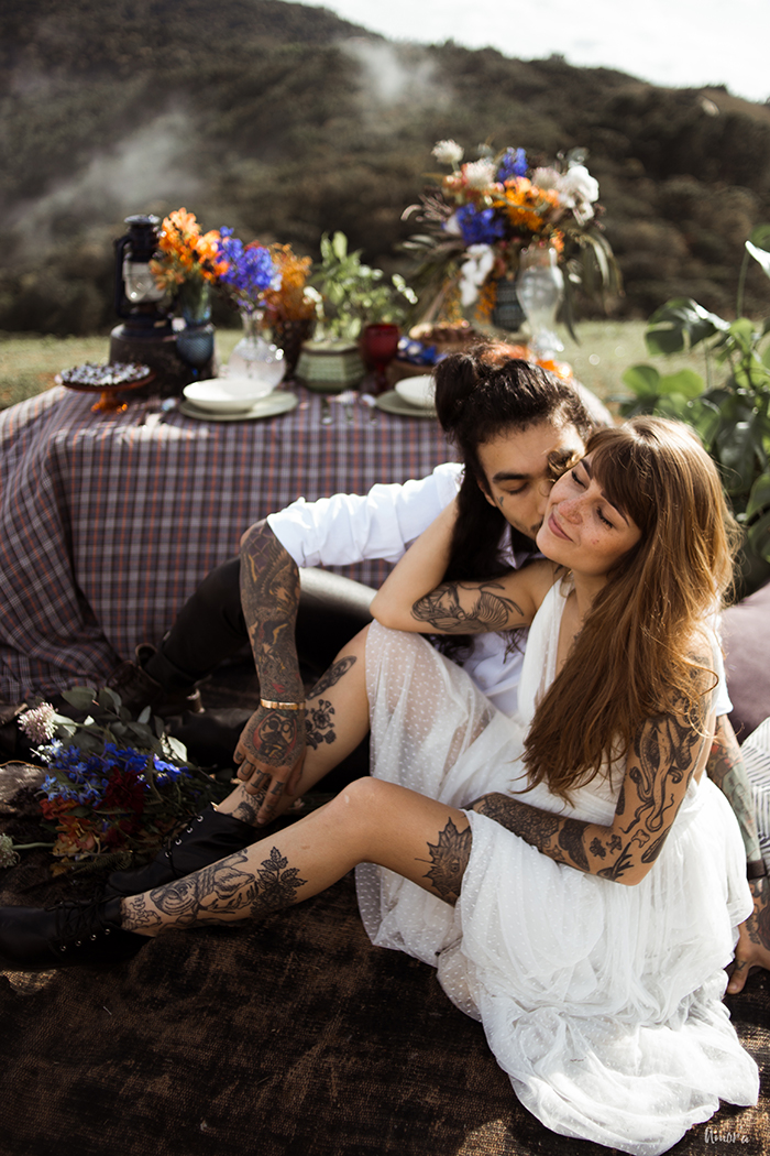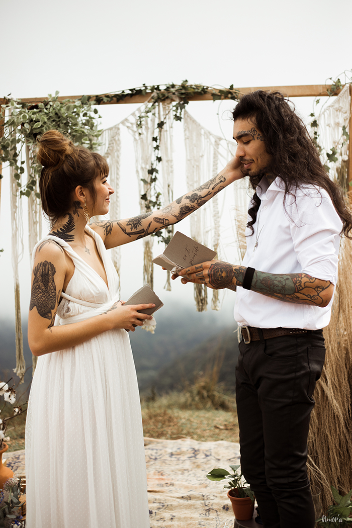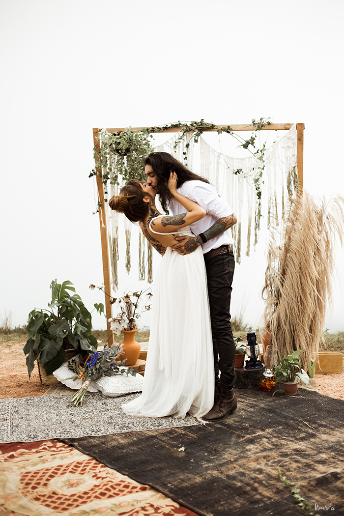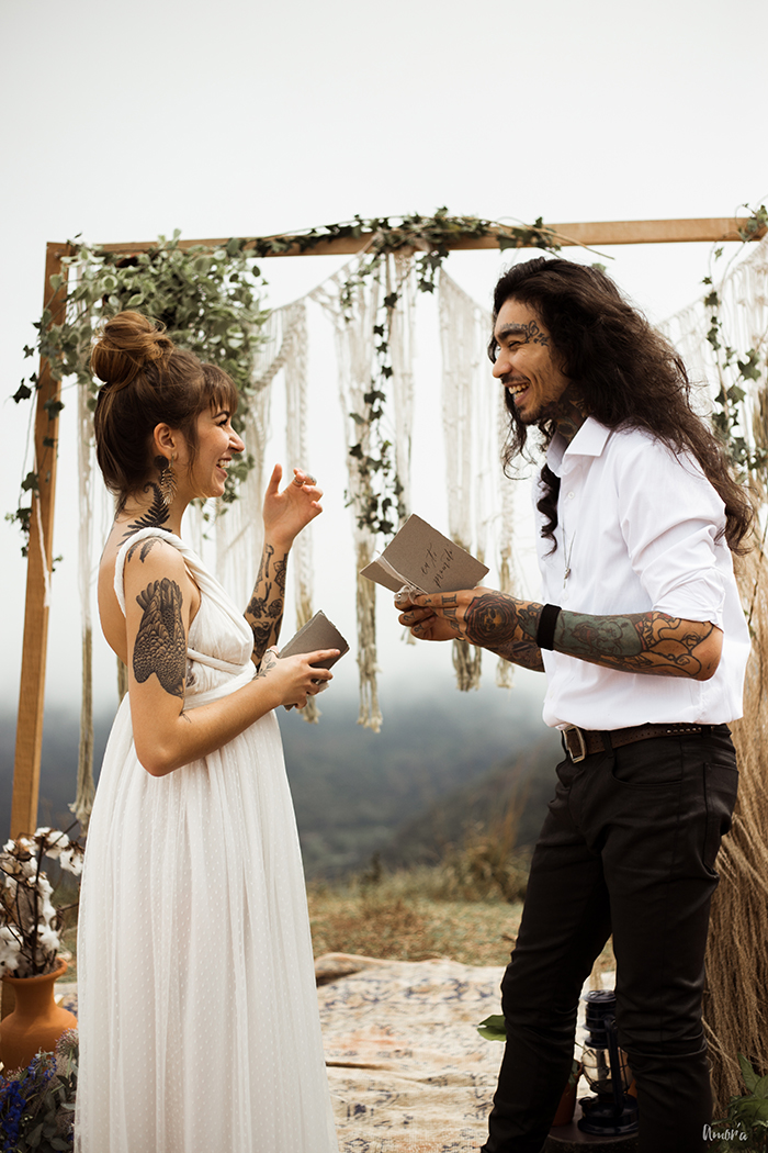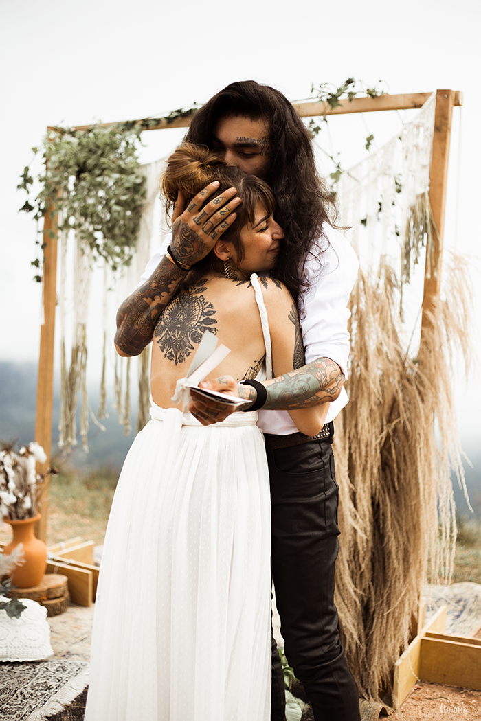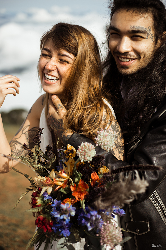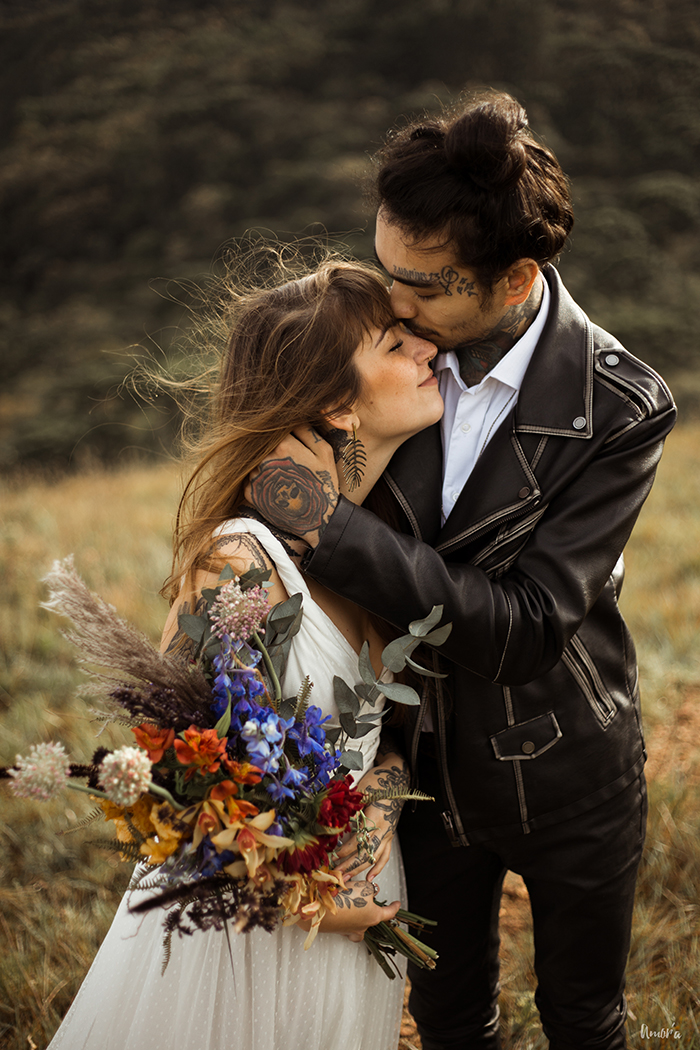 Os noivos, que são um casal de verdade e super alternativos, esbanjaram estilo no look, que realçou muito a personalidade deles como indivíduos. Botas pesadas, jaqueta de couro, tatuagens a mostra, pouca maquiagem e cabelos soltos, pra mostrar que sim, você pode ser quem você quiser no seu grande dia.