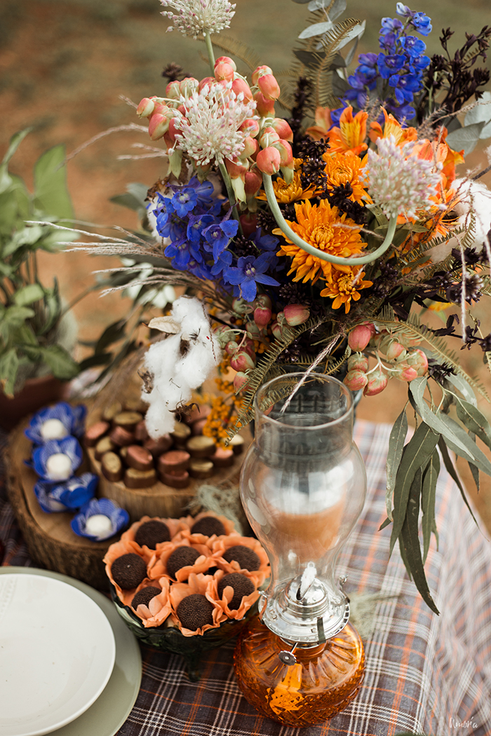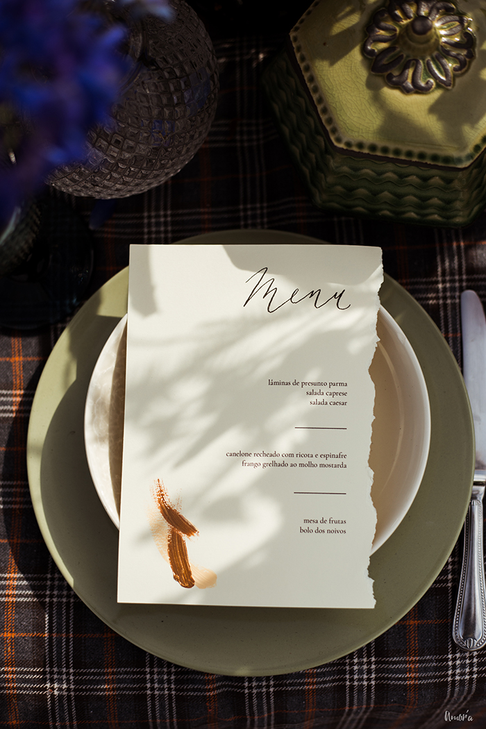 Toda decoração seguiu uma proposta boho com mix de tapetes, altar de macramê, almofadas no chão e paleta com cores mais frias e fechadas. Para harmonizar, a papelaria foi bem despojada mas sem perder a elegância; dessas pra guardar pra vida mesmo.