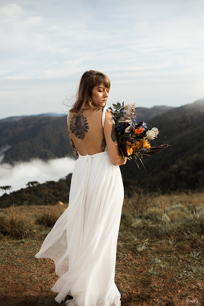 Realizado na Pedra do Baú, o nome do editorial é inspirado no filme Into The Wild, um filme que retrata bem a busca pelo espírito de liberdade. Ele traz a proposta de um elopement wedding (clique aqui para se inspirar com outros casamentos a dois que já passaram pelo blog), formato que vem crescido a cada dia mais no mercado, com uma pegada bem selvagem e rock n’ roll.