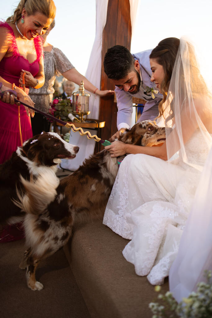 “Para nós, o momento mais emocionante foi a entrada das alianças, tendo como daminhas/floristas nossas cachorras e a aliança, propriamente dita, pelo nosso sobrinho de 3 anos.”