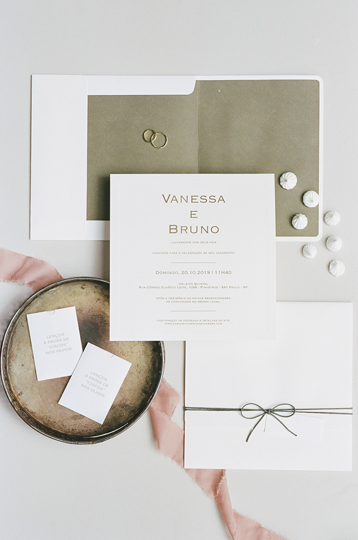 Adoramos o convite minimalista feito pelo Papel e Estilo! Verde oliva e branco formam uma combinação infalível.