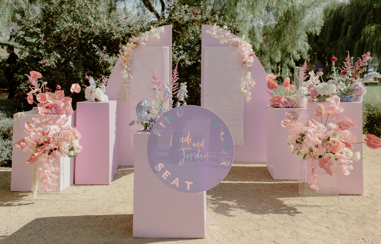 44) Prefere uma vibe mais glamourosa? Decore o seu bar de casamento ao ar livre com recortes geométricos