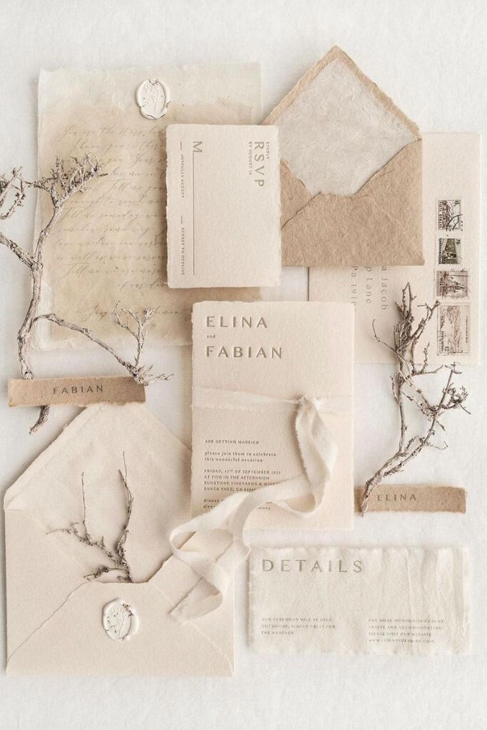 O convite pode ser feito em papel reciclado, ter uma aquarela, lacre de cera, tassel ou flores secas.