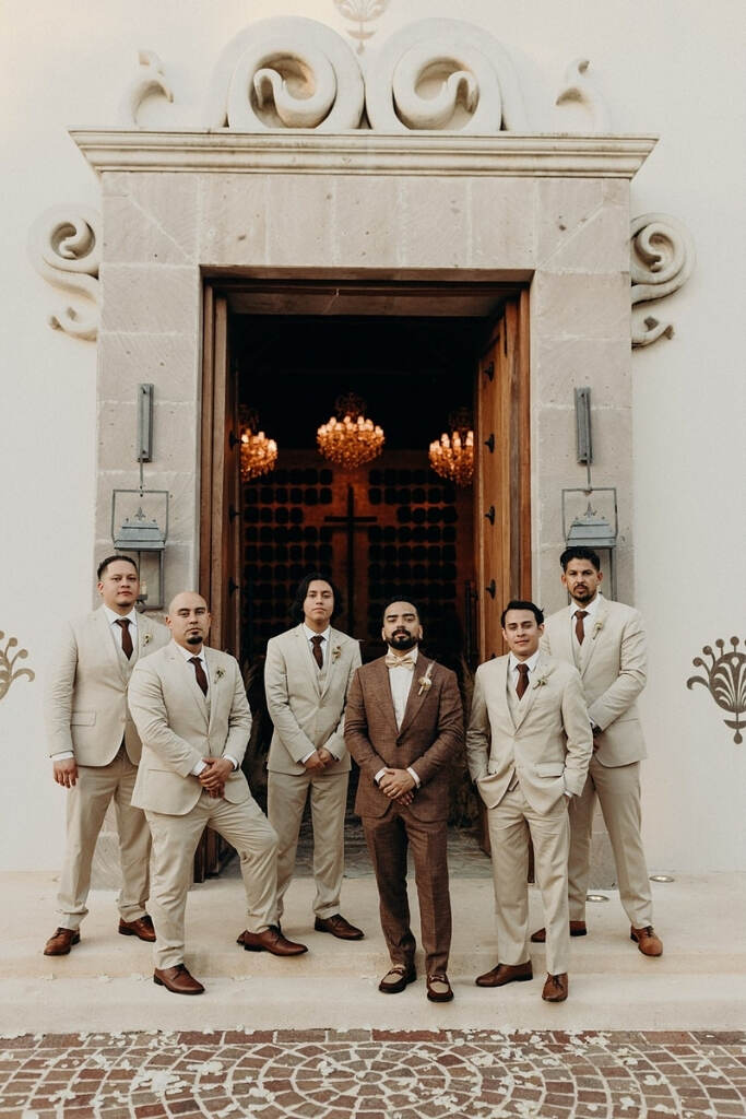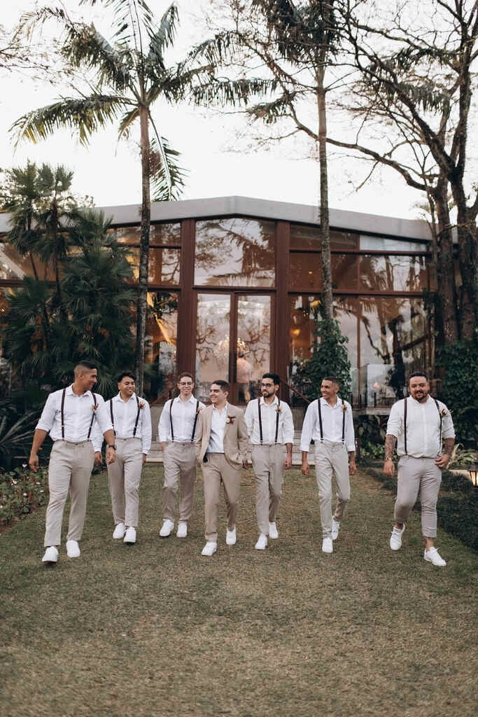 Os padrinhos podem apostar na paleta do traje do noivo, como cinza claro, marrom, caqui, verde oliva e até mesmo bordô para os mas ousados. Mas sempre em um tom mais claro ou escuro do que o do noivo.