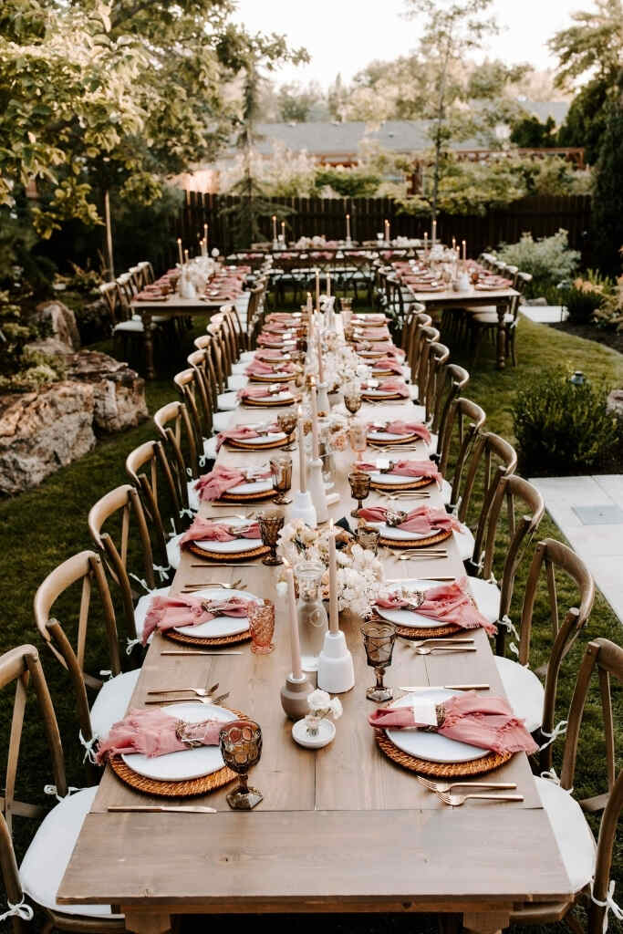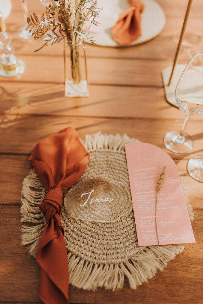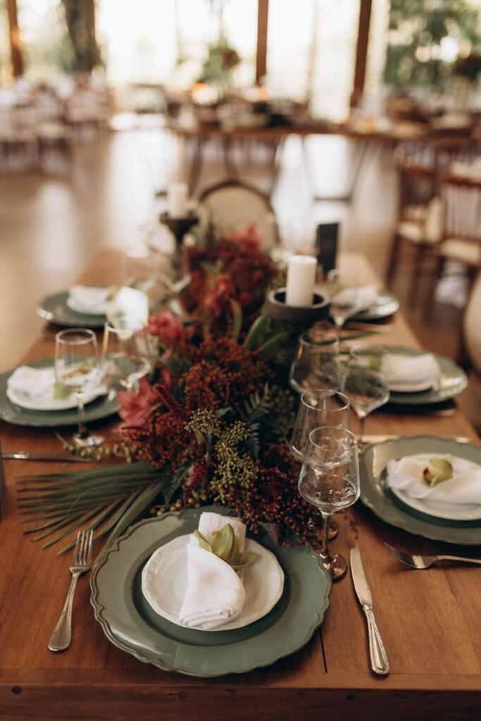 Um casamento boho chic deve priorizar a atmosfera intimista, então uma mesa posta bonita e com itens que remetam a natureza, como frutas, flores e folhagens é essencial.