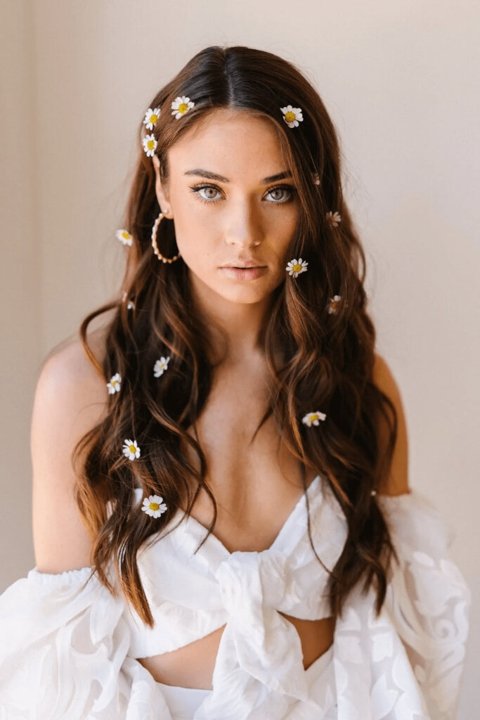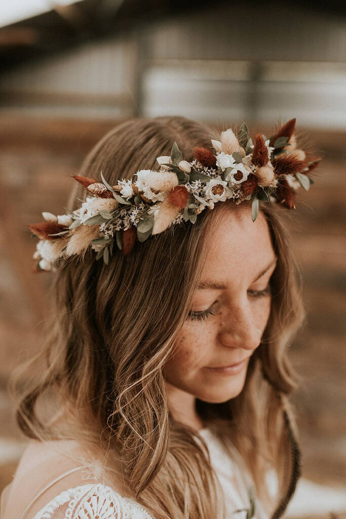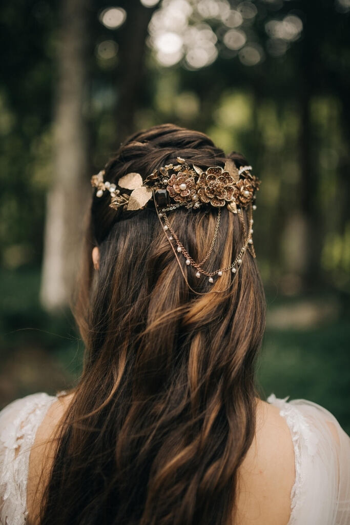 Uma noiva boho chic pode usar headband, tiara, coroa, grampos, pérolas e até flores.