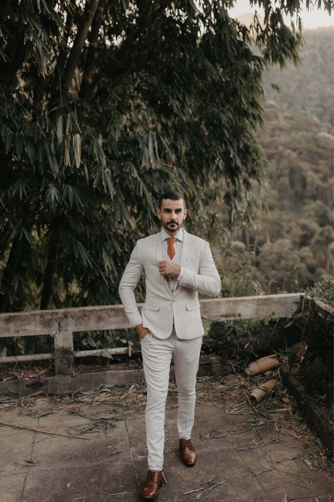 O noivo costuma usar um traje mais claro como cinza claro, marrom, caqui, verde oliva e até mesmo bordô para os mas ousados.