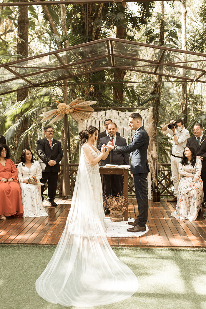 Apaixonada por decoração, a noiva apostou no boho chic por se identificarem com o estilo de leveza atrelada a natureza e folhagens secas. Os tons terrosos sempre foram os queridinhos da paleta de inspiração.