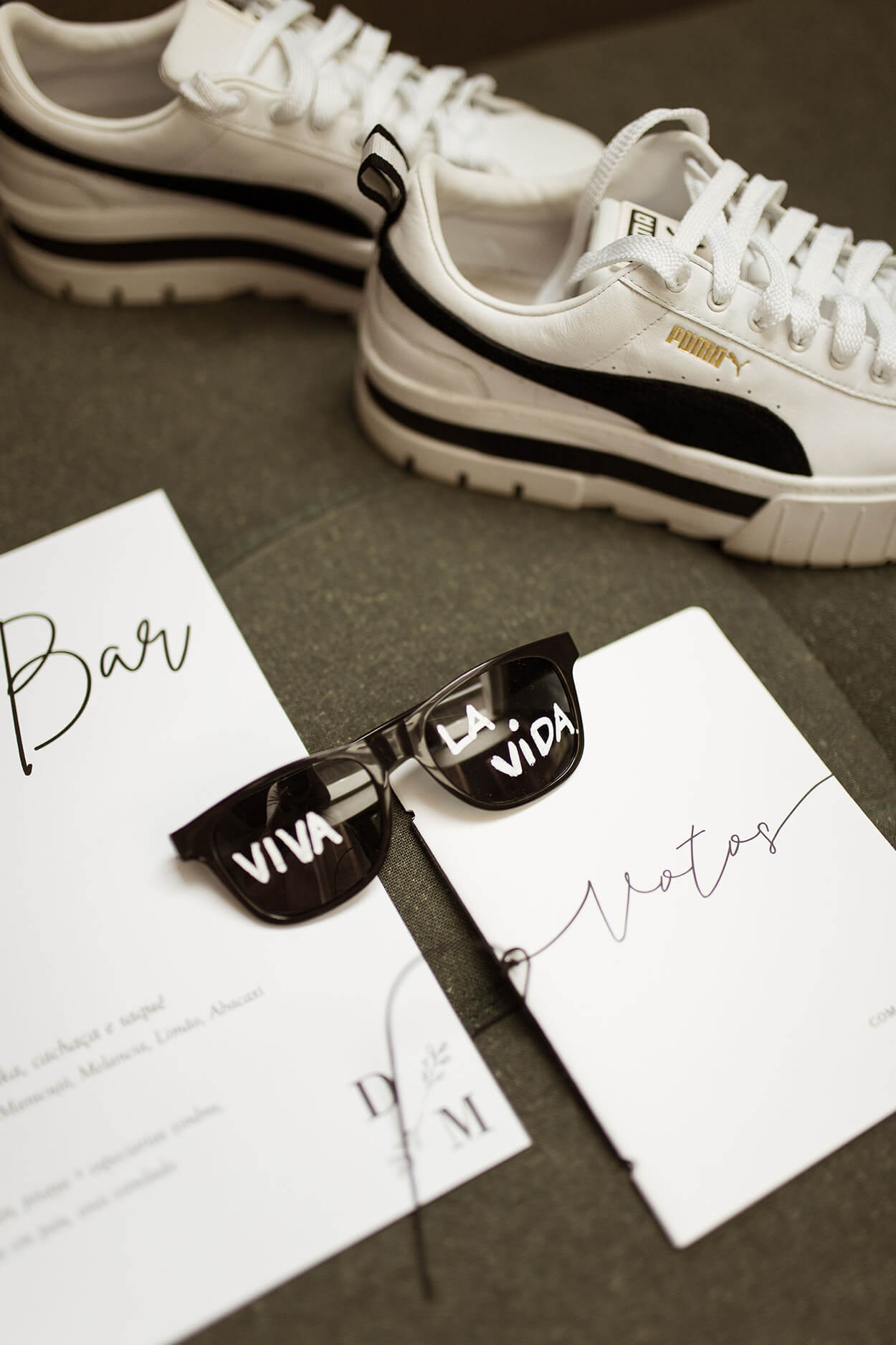 Outro detalhe que podemos notar ao fundo dos convites e fotos é a lembrancinha: uma pashmina terracota da Pashmina Wedding.
