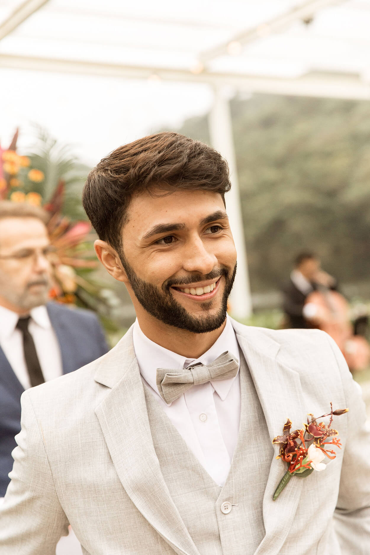 Em contraste, o noivo aderiu a um look mais formal, com o terno de três peças.