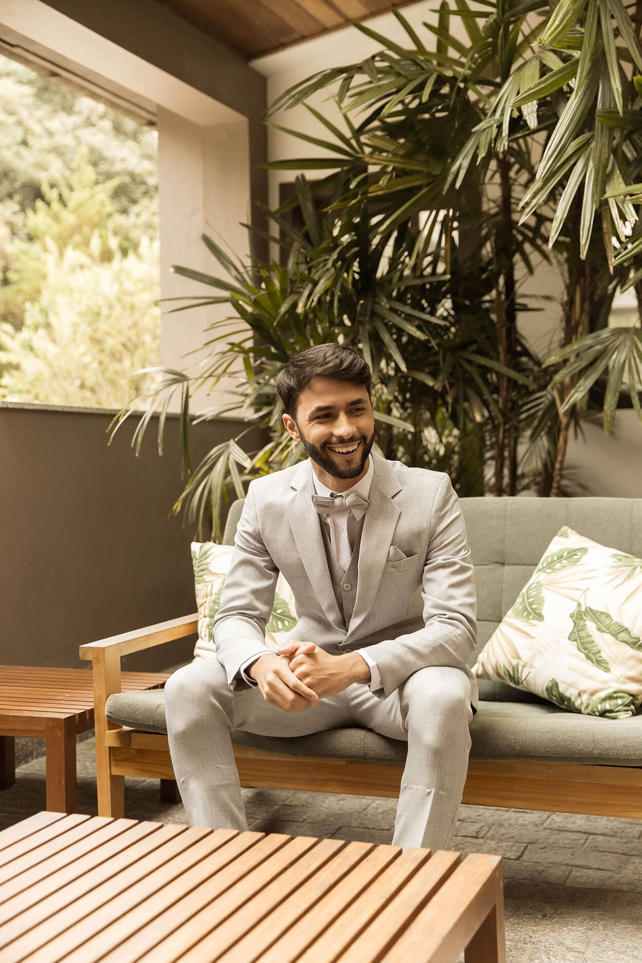 Porém, o tom de cinza e a gravata borboleta garantiram um visual mais leve.