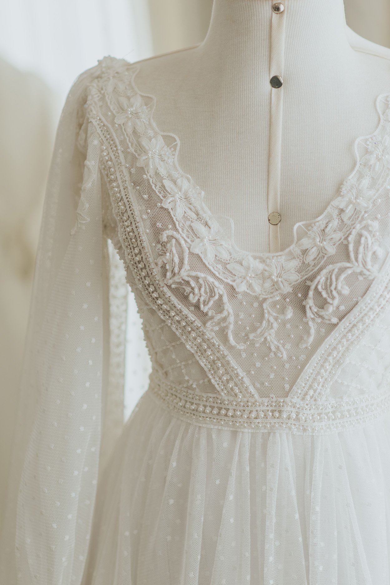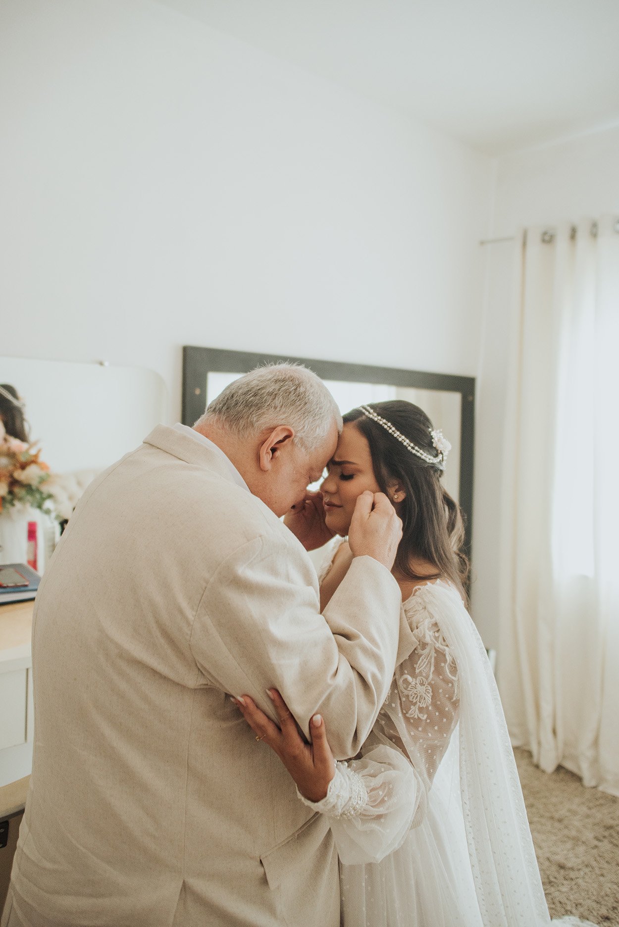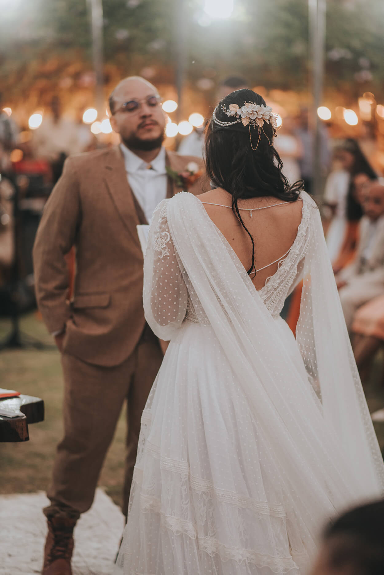 Estamos aqui suspirando com o visual escolhido pela Laura para dizer sim ao amor da sua vida. O vestido de manga longa com capa, rendas delicadas, aplicações de pérolas e muito poá combinou perfeitamente com a grinalda. Tudo em perfeita harmonia para um look encantador.