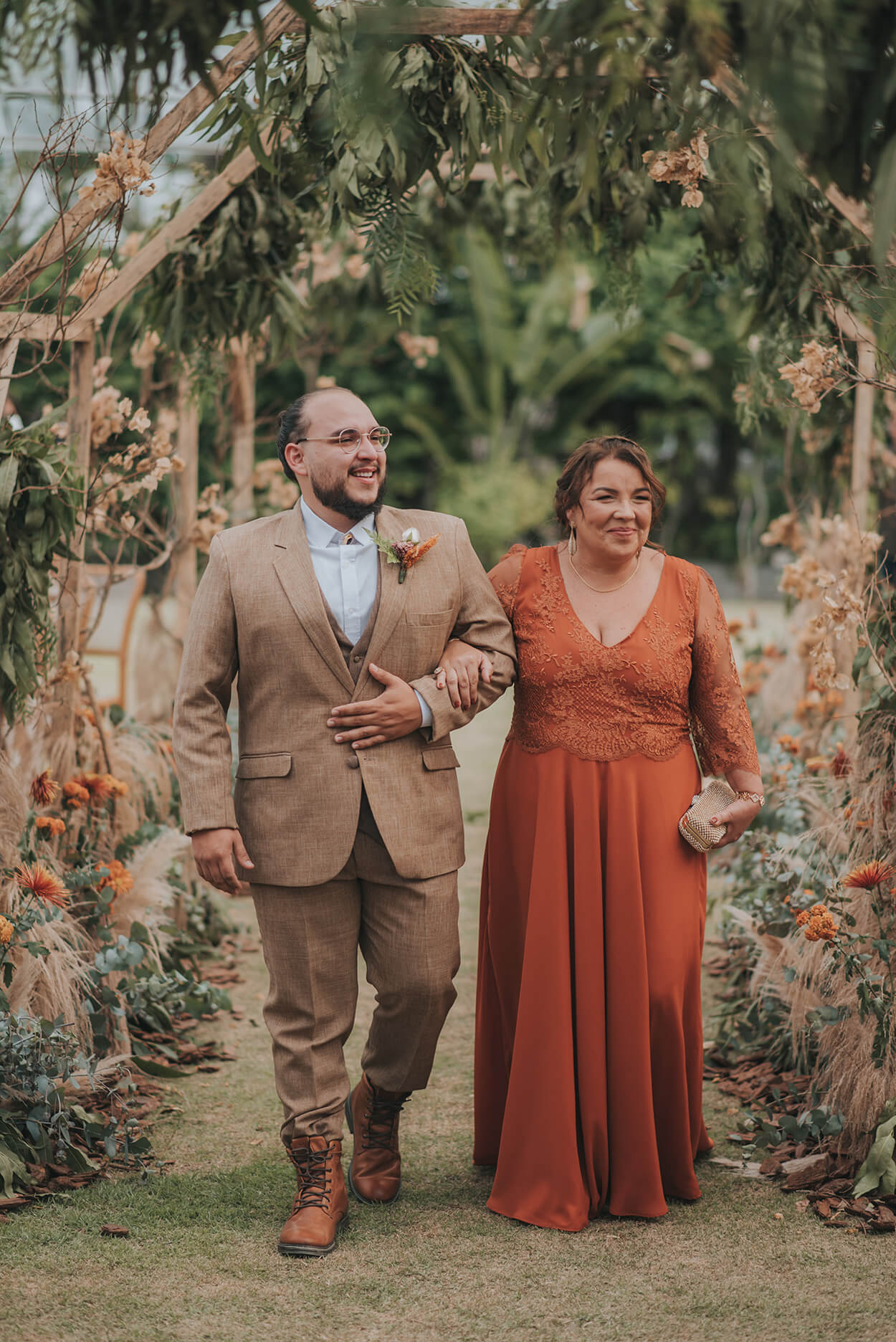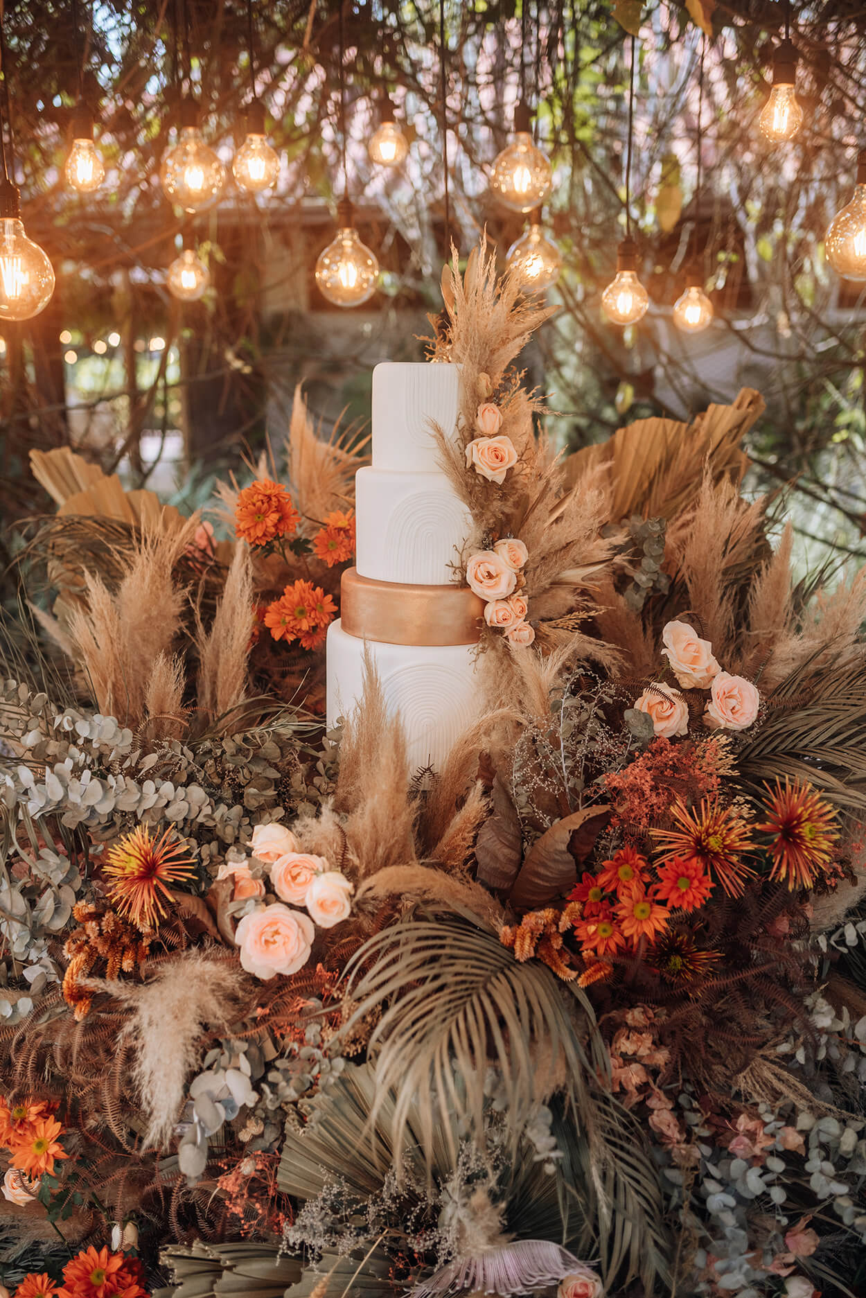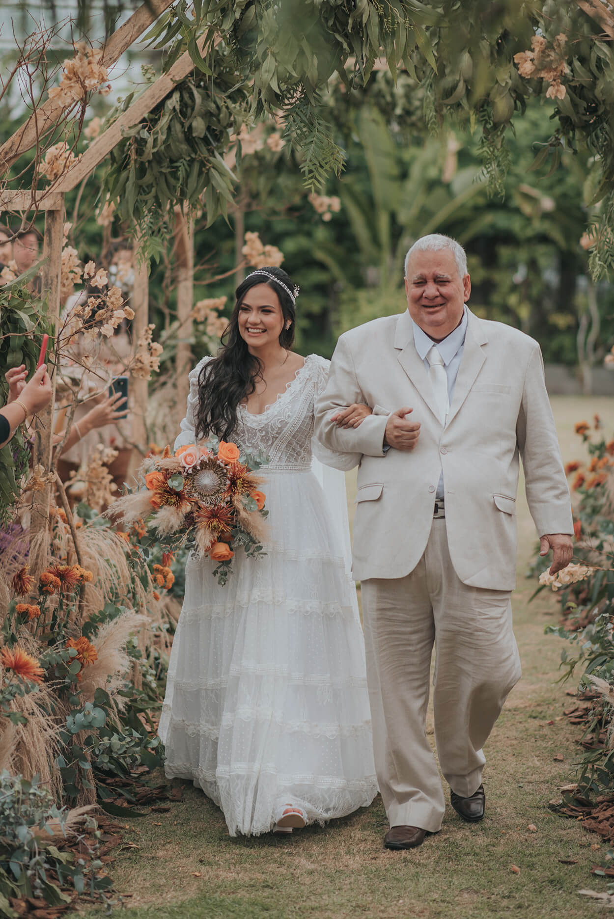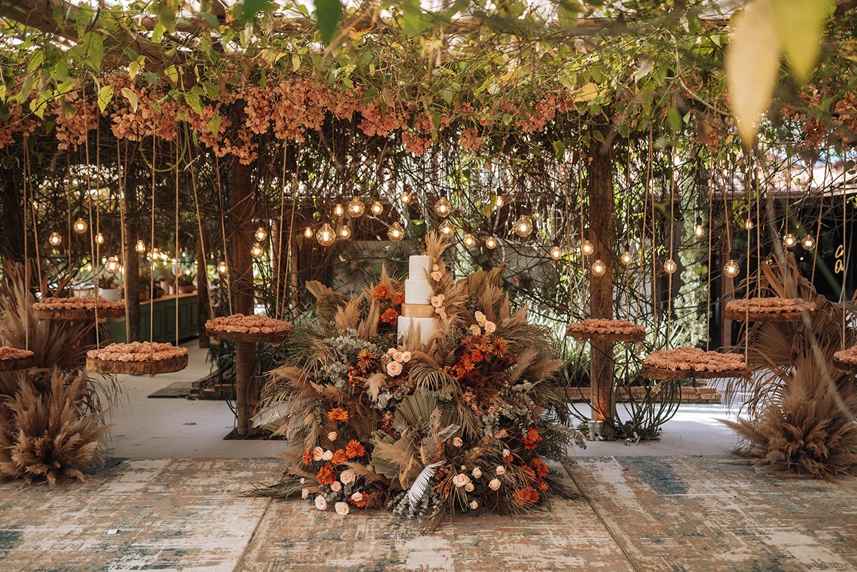 Também precisamos destacar a beleza do buquê seguindo a linha dos tons terrosos de todo o casamento com folhas de eucalipto, capim dos pampas, rosas e uma imponente protea. Salvando já essa inspiração na nossa pastinha!
