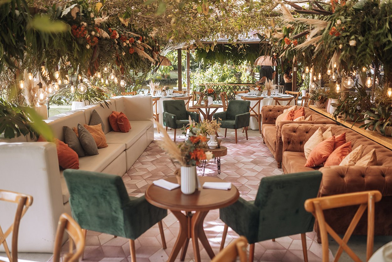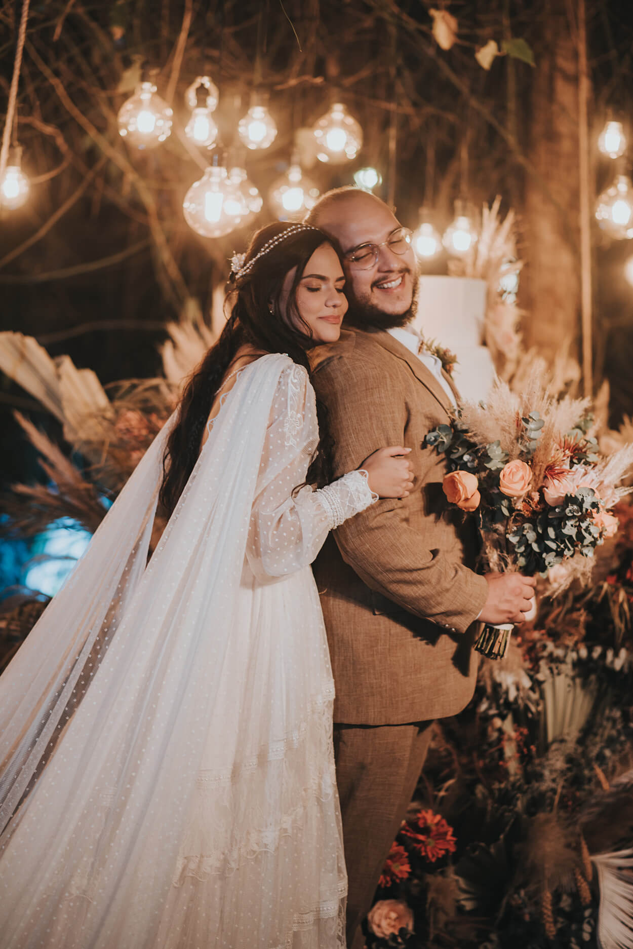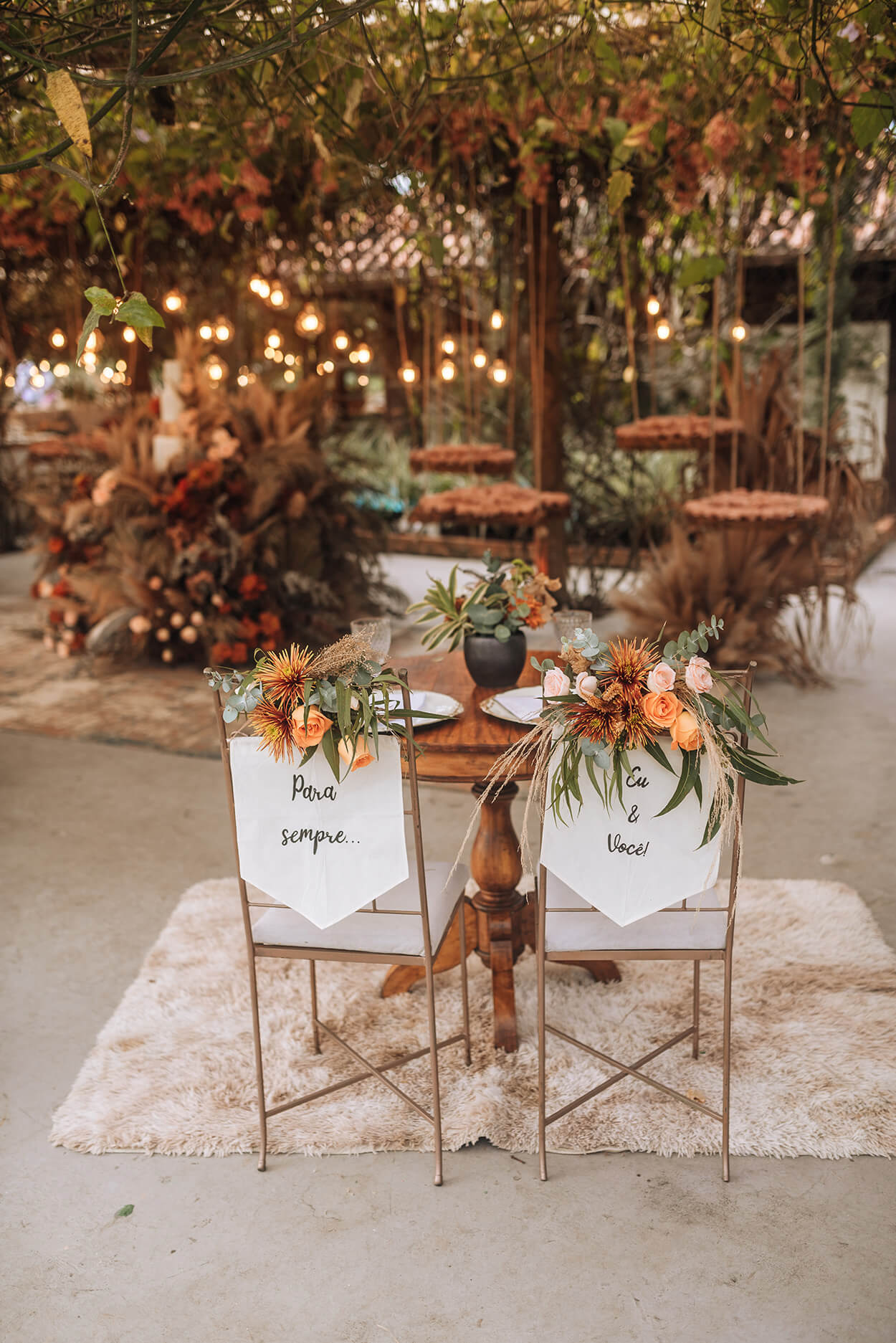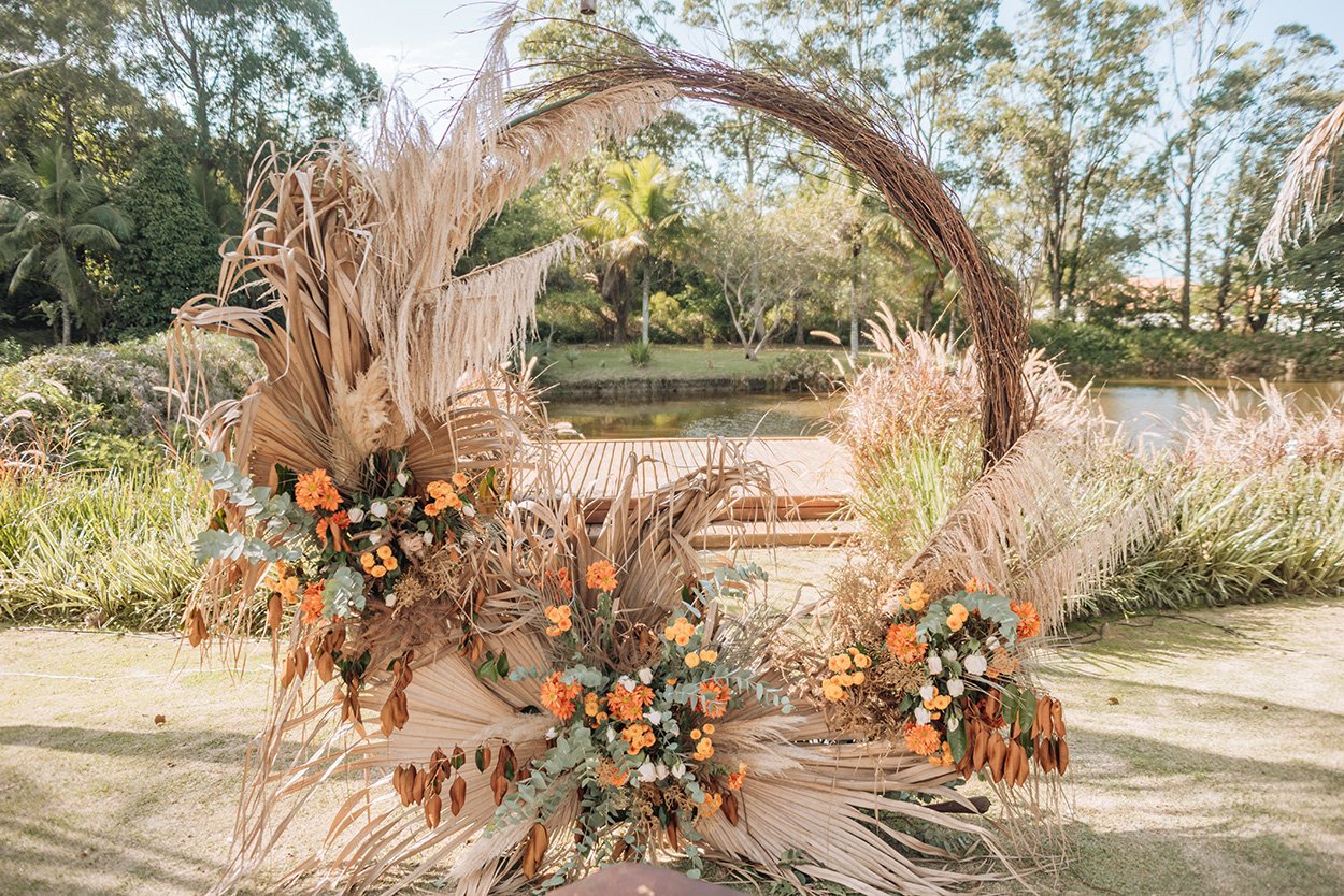 O casal tinha duas exigências: casar em um local aconchegante, com cara de casa e dizem SIM de frente ao lago. “Juntamos tudo isso com nossas ideias de decoração e com o sentimento que queríamos passar aos convidados no dia, e chegamos ao estilo boho chic”.