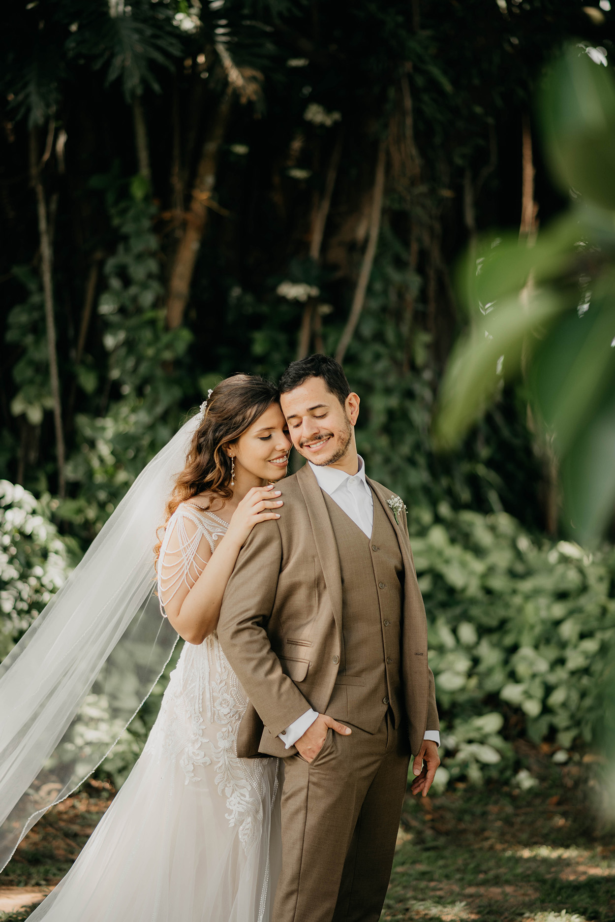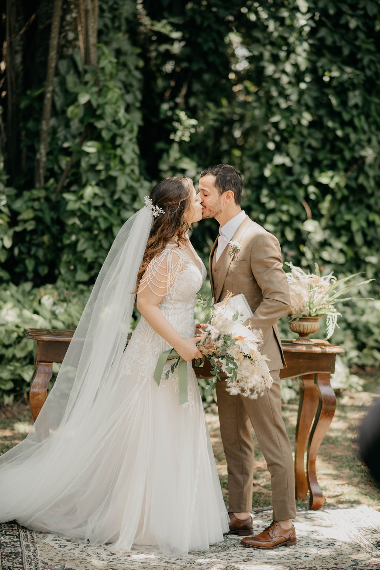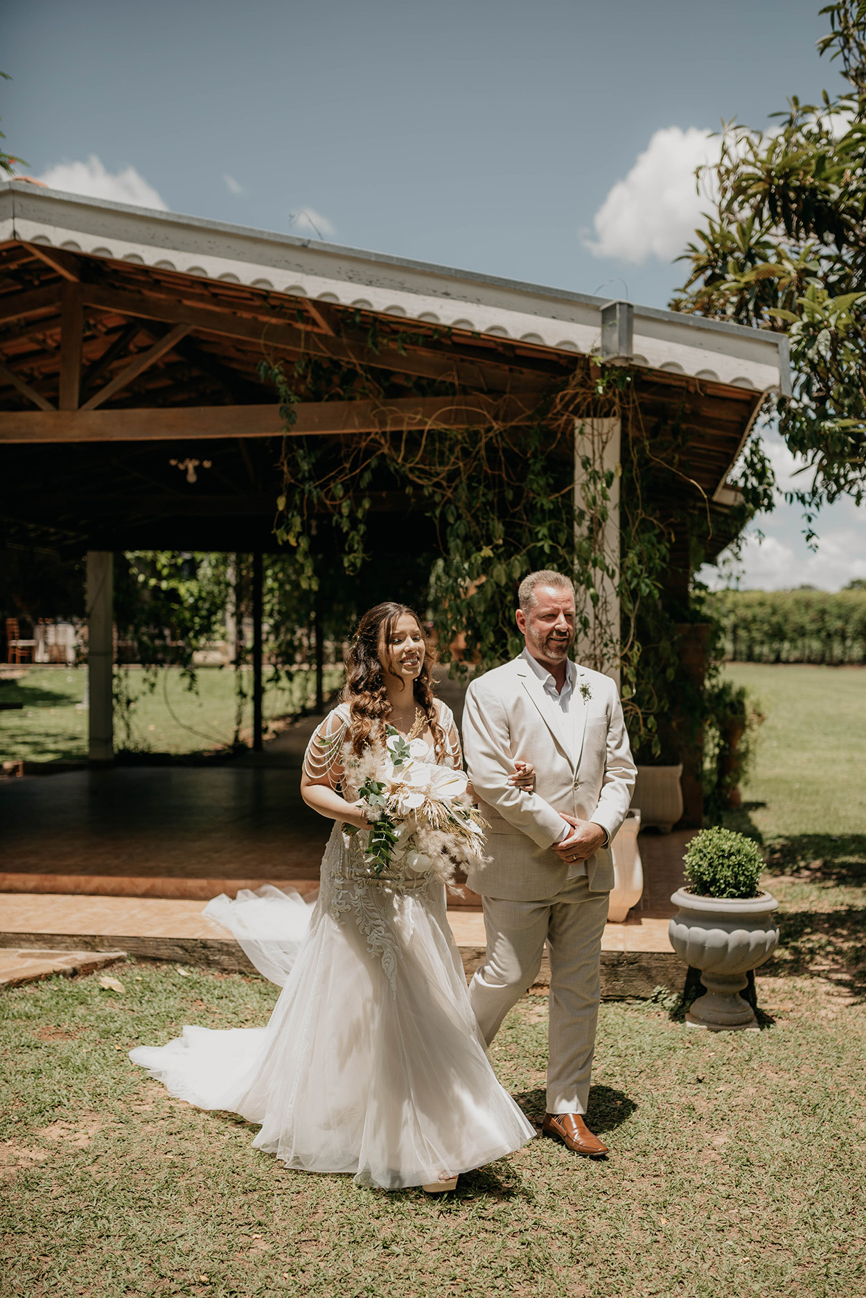 Numa manhã ensolarada, cercados pela natureza, a Giovanna caminhou até o amor da sua vida com um belíssimo vestido que amamos!