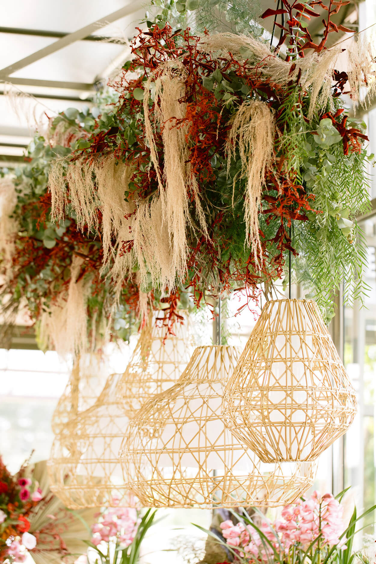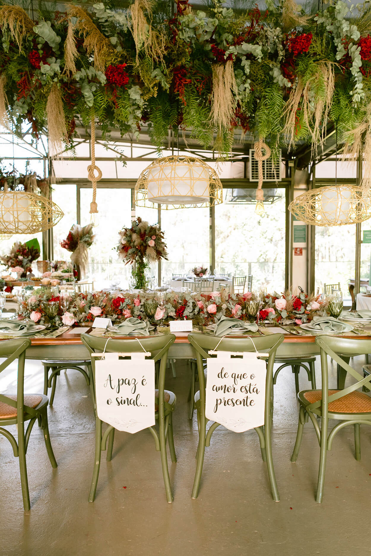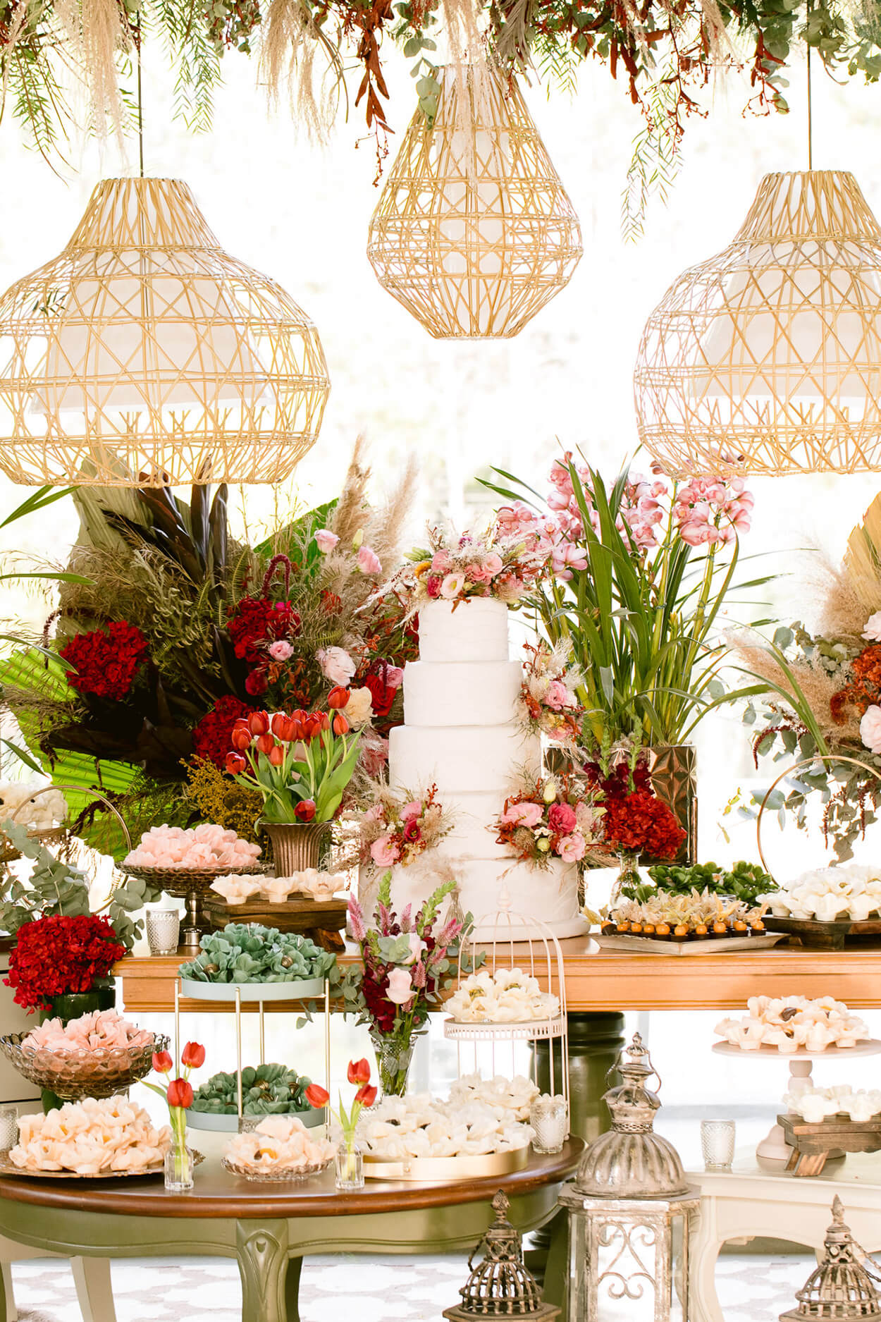 Poderíamos ficar horas e horas falando sobre a mesa posta e a mesa do bolo. Mas vamos focar nos arranjos suspensos: eles trazem frescor e acrescentam ainda mais personalidade aos ambientes.