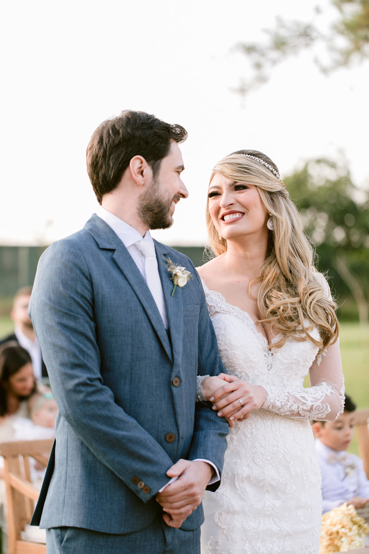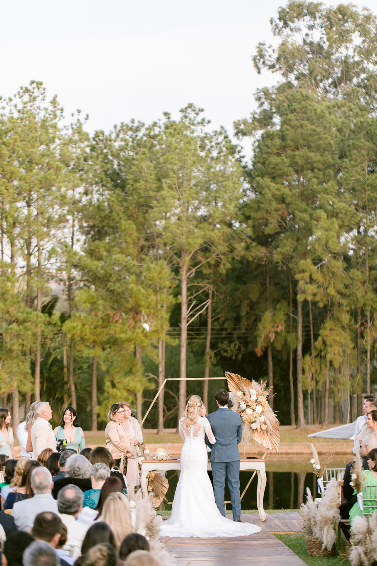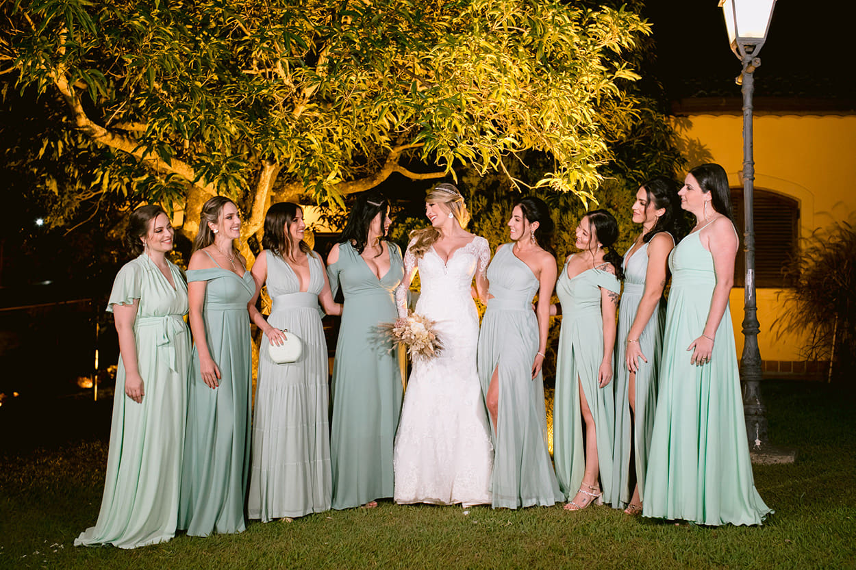 Veja, a Vivian preferiu deixar o altar com cores mais suaves. Por outro lado, a decor do salão é mais colorida e contrastante. As madrinhas já estavam usando o verde claro, por isso, uma boa saída foi apostar no nude e no bege para deixar os pais mais harmônicos em relação ao casal e ao ambiente.