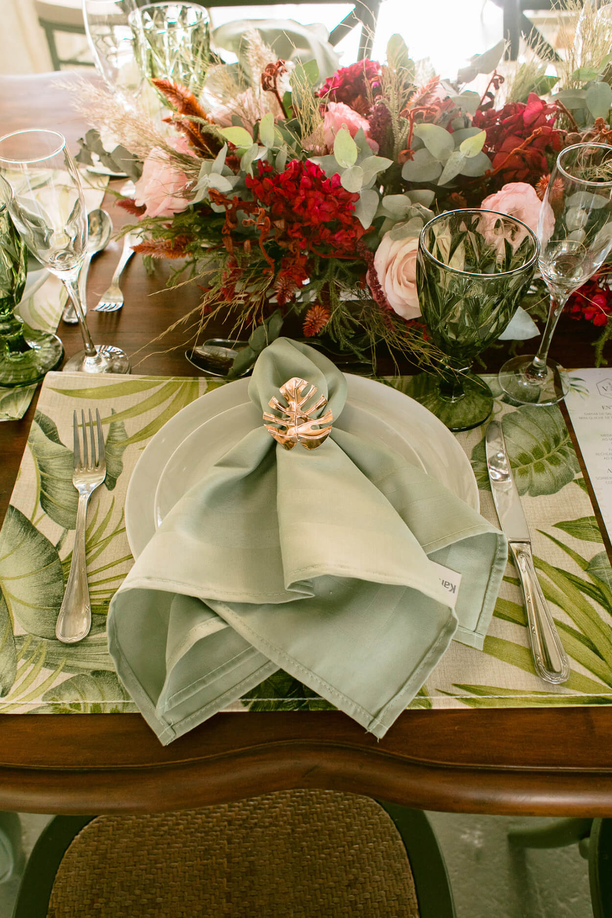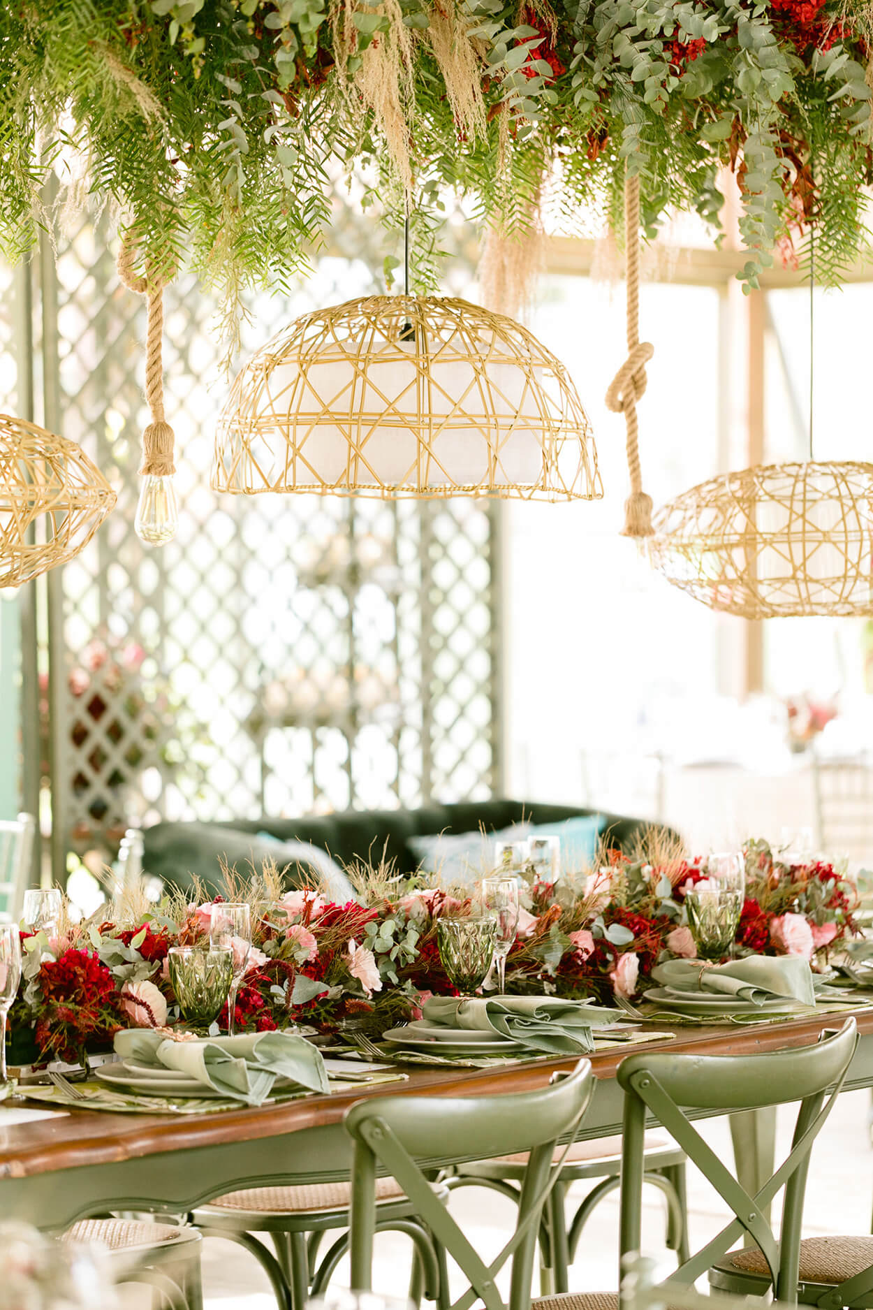 E aqui podemos ver nitidamente que há uma grande influência do estilo romântico. A paleta une o verde sage ao vermelho para criar contraste e conta com o rosa e o tom de palha para trazer mais aconchegante e delicadeza.