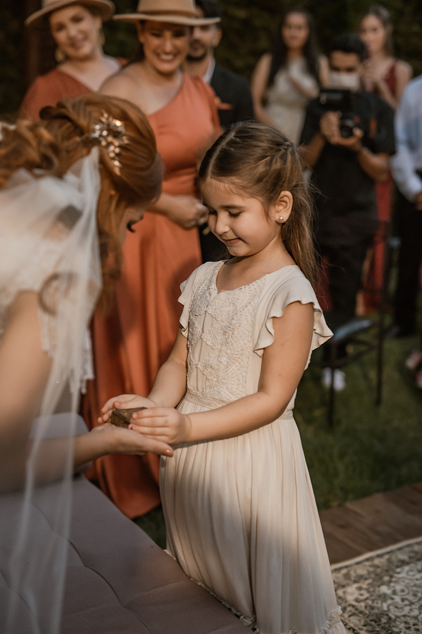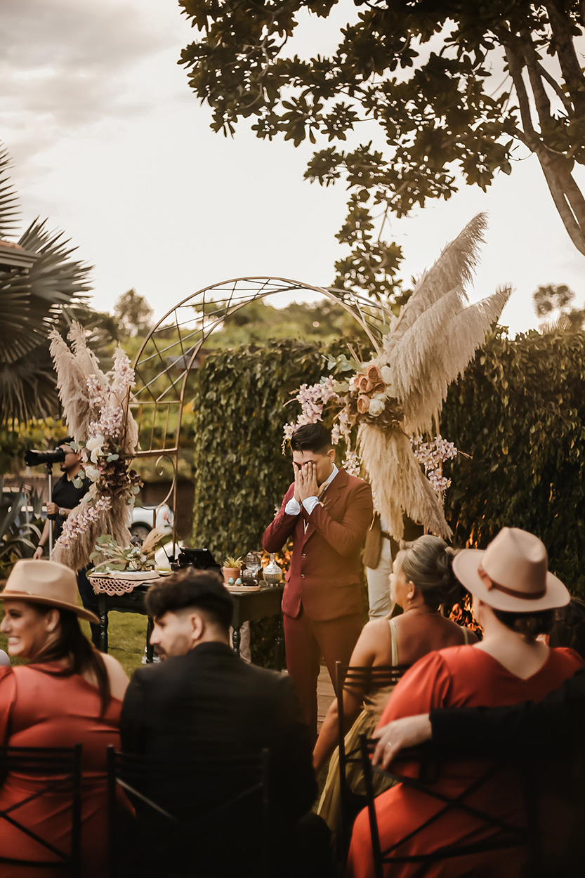 Os estilos para decorar o espaço foram o boho e folk em tons de terracota, verde musgo e tons rosê, tudo em perfeita harmonia com a personalidade do casal. E adivinhem, foram os noivos que montaram toda a decoração.