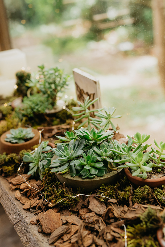 Para serem entregues de lembrancinha, a Caroline e o Moisés foram juntos comprar mini cactos. Escolheram todos um a um e a Carol, mais uma vez, passou horas e horas replantando todos os 100 mini cactos em vasinhos definitivos, com lacinhos que foram criados e colocados por ela.
