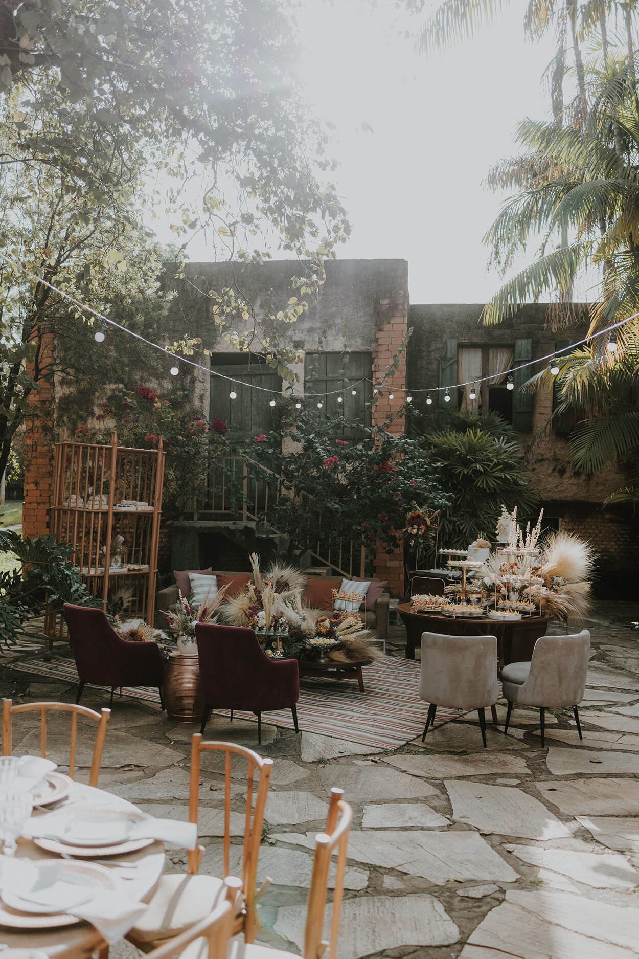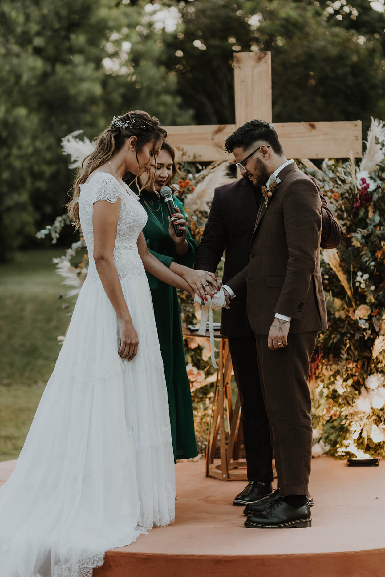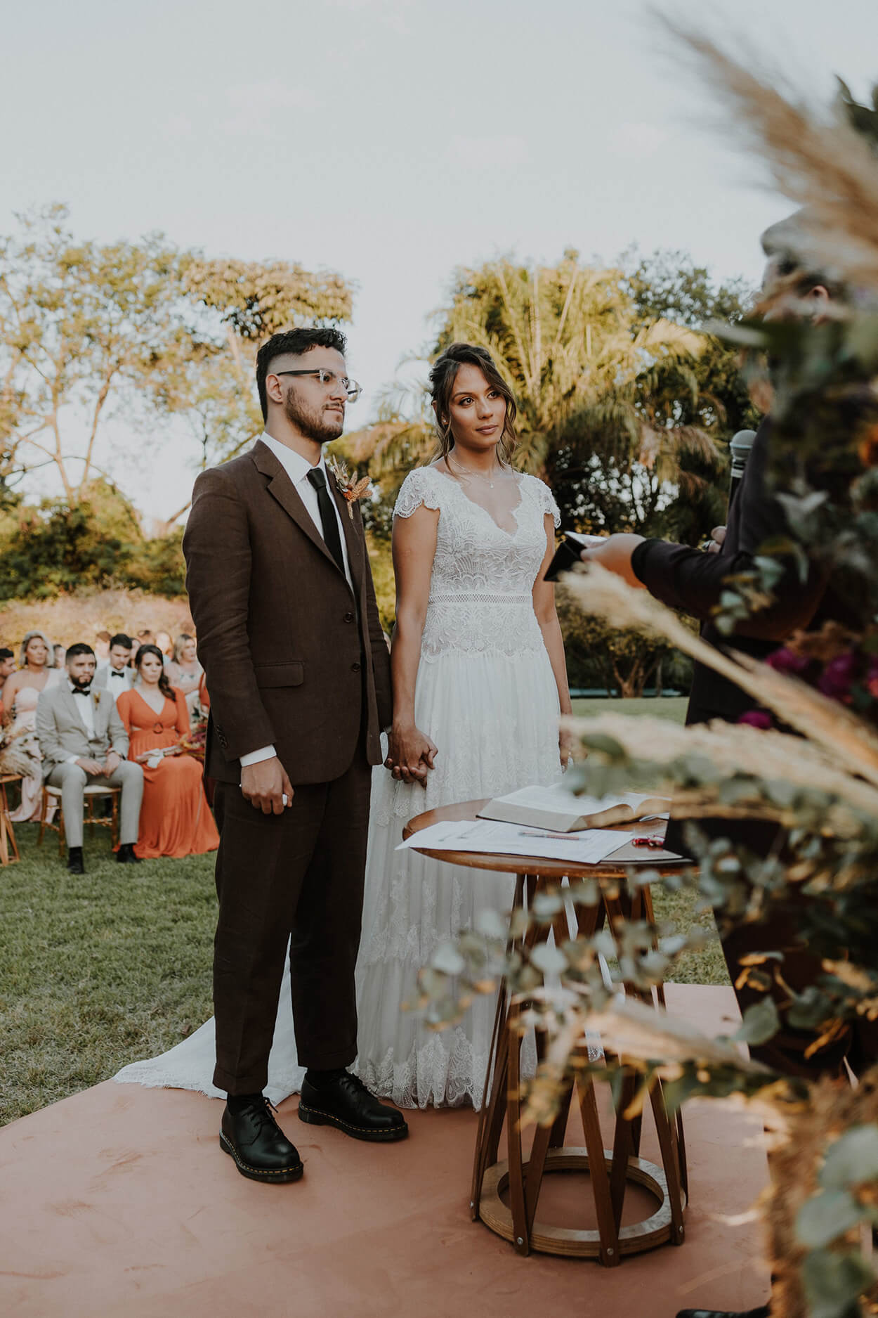 E quem disse que um casamento boho não pode ter uma pegada geek? “Reproduzimos uma cena de Game of Thrones na hora das alianças. Na cena, o celebrante entrelaça as mãos do casal com uma fita simbolizando o selo eterno. Foi emocionante!”